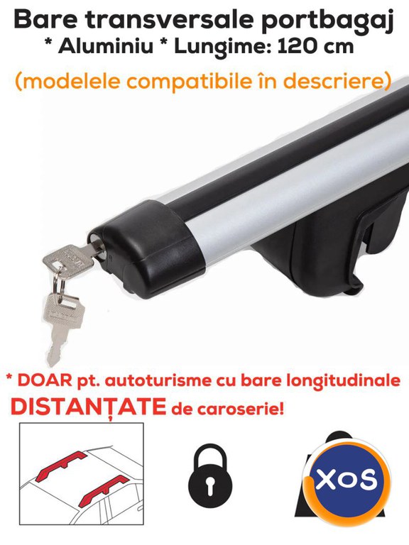 *** Bare Transversale Portbagaj cu cheie - ALUMINIU - 120 cm - Sarcina maxima admisa: 90 kg - Montaj pe longitudinale distantate (nelipite) *** Modelele compatibile sunt trecute mai jos, in descriere. Va rog sa cititi inainte de a comanda! 1) ATENTIE!!! Barele se monteaza doar pe autoturismele cu bare longitudinale DISTANTATE de caroserie!!! Barele se potrivesc DOAR pe modelul si tipul de caroserie mentionat in anunt (mai jos, in descriere) 2) Produsele sunt vandute de societate comerciala, sunt noi, sigilate! Sunt insotite de factura, termen de retur 14 zile lucratoare doar la produse nemontate/nefolosite. 3) Setul de bare transversale cuprinde toate elementele necesare pentru montarea pe barele longitudinale ale autoturismului. Barele au sectiune aerodinamica si se potrivesc pentru toate tipurile de portbagaje (cutii portbagaj, suport bicicleta, suport schi, portbagaj caiac/canoe, etc.). Profilul barelor transversale ajuta la minimalizarea zgomotului si reduce rezistenta aerodinamica. Setul de bare contine: - 2 x Bare portbagaj din aluminiu - 4 x Sisteme de prindere pe barele longitudinale - 1 x Cheie imbus (nu este necesara o alta unealta) - 2 chei Specificatii tehnice: - Lungimea barelor din set: 120 cm - Sarcina maxima admisa: 90 kg ( 2 x 45 kg). - Inaltime bara: 2.80 cm - Latime bara: 5 cm - Material: ALUMINIU - Protectie antifurt cu cheie: DA. - Numar bare in set: 2 buc. - Culoare: Argintiu. - In conformitate cu DIN 75302 Modele compatibile: ALFA ROMEO 156 1996-2007 Combi AUDI A4 B5 1994-2001 Combi AUDI A4 B6 2000-2006 Combi AUDI A4 B7 2004->2008 Combi AUDI A4 B8 2008-2016 Allroad Avant AUDI A6 C5 1997-2004 Allroad Avant AUDI A6 C7 2011->2018 Allroad Avant BMW Seria 3 E36 1990-1997 Combi BMW Seria 3 E46 1997-2004 Combi BMW Seria 3 E91 2004-2008 Pre-Facelift Combi BMW Seria 5 E39 1995-2003 Combi BMW Seria 5 E61 2003-2010 Combi CHEVROLET Captiva I 2006-2019 CHEVROLET Cruze I 2011-2016 Facelift CHEVROLET Lacetti 2002-2009 Combi CHEVROLET Spark III (M300) 2009-2015 CITROEN C5 I (DC/DE) 2001-2007 Combi CITROEN C5 II (RD/TD) 2007-2019 Combi CUPRA Ateca 2016-prezent DACIA Dokker 2012-2021 (5 locuri) DACIA Duster I 2010-2013 Pre-Facelift DACIA Duster II 2018-2023 DACIA Jogger 2021-2023 Pre-Facelift DACIA Logan MCV I 2006-2012 DACIA Logan MCV II 2012-2020 DACIA Logan MCV Stepway 2013-2020 DACIA Sandero Stepway I 2008-2012 DACIA Sandero Stepway II 2012-2020 DACIA Sandero Stepway III 2020-prezent FIAT Croma II 2007-2010 Facelift FIAT Idea 2003-2012 FIAT Sedici 2005-2014 FORD Focus I 1998-2004 Combi FORD Focus II 2004-2010 Combi FORD Mondeo III 2000-2007 Combi FORD Mondeo IV 2007-2010 Pre-Facelift Combi FORD Tourneo Courier 2014-2023 FORD Transit Courier I 2014-2023 HYUNDAI i30 I 2006-2012 Combi HYUNDAI Santa Fe I 2000-2006 HYUNDAI Terracan 2004-2011 HYUNDAI Tucson I 2004-2009 JEEP Cherokee (KJ) 2002-2007 JEEP Grand Cherokee (WJ) 1999-2005 JEEP Patriot 2007-2017 KIA Carens I 1999-2006 KIA Carens II 2006-2013 KIA Carnival II 2005-2014 KIA Cee'd I 2006-2012 Combi KIA Sportage II 2004-2010 LAND ROVER Freelander I 1997-2006 LEXUS RX (AL10) 2008-2015 LEXUS RX (XU30) 2003-2009 MAZDA 5 II 2004-2010 MAZDA 6 II 2007-2012 Combi MAZDA 6 III 2012-prezent Combi MERCEDES Clasa C W203 2000-2007 Combi MERCEDES Clasa C W204 2008-2015 Combi MG ZS 2018-prezent MINI Countryman (F60) 2016-2023 MITSUBISHI Pajero Pinin 1998-2007 MITSUBISHI Pajero Pinin 1998-2007 MITSUBISHI Space Star 1999-2002 Pre-Facelift NISSAN Qashqai II (J11) 2013-2021 NISSAN X-Trail III (T32) 2013-2021 OPEL Agila A 2000-2007 OPEL Astra G 1998-2009 Combi OPEL Vectra B 1995-2002 Combi OPEL Zafira A 1999-2005 PEUGEOT 2008 I 2013-2019 PEUGEOT 206 1998-2013 Combi PEUGEOT 207 2006->2014 Combi PEUGEOT 307 2001->2008 Combi PEUGEOT 308 I 2007-2013 Combi PEUGEOT 406 1995-2007 Combi PEUGEOT 407 2004->2012 Combi RENAULT Clio III 2005-2014 Combi RENAULT Clio IV 2012-2020 Combi RENAULT Laguna I 1998-2001 Facelift Combi RENAULT Laguna II 2001-2008 Combi RENAULT Laguna III 2008-2015 Combi RENAULT Megane II 2002-2008 Combi RENAULT Megane III 2008-2016 Combi RENAULT Scenic III 2009-2015 SEAT Ateca 2016-prezent SEAT Exeo 2008-2013 Combi SKODA Fabia I 1999-2007 Combi SKODA Fabia II 2007-2014 Combi SKODA Fabia III 2014-2021 Combi SKODA Kamiq 2019-prezent SKODA Karoq 2017-prezent SKODA Kodiaq I 2017-2023 SKODA Octavia I 1996-2010 Combi SKODA Octavia II 2004-2013 Combi SKODA Octavia III 2013-2019 Combi SKODA Praktik 2006-2015 SKODA Roomster 2006-2015 SKODA Superb II 2008-2015 Combi SUBARU Forester V (SK) 2018-prezent SUBARU Impreza II 2000-2007 SUZUKI Grand Vitara 1998-2005 SUZUKI Ignis I 2000-2008 SUZUKI Ignis II 2016-prezent SUZUKI Jimny 1998-2018 SUZUKI SX4 S-Cross 2006-2012 SUZUKI Vitara XL 1998-2005 (7 locuri) TOYOTA Avensis I (T220) 1997-2002 Combi TOYOTA Avensis II (T250) 2003-2009 Combi TOYOTA Hilux VII 2004-2015 TOYOTA Land Cruiser Prado J120 2002-2009 TOYOTA Rav 4 (XA20) 2000-2005 TOYOTA Rav 4 (XA30) 2005-2012 VOLKSWAGEN Bora 1999-2006 Combi VOLKSWAGEN Caddy III 2003-2021 VOLKSWAGEN Cross Polo 2006-2009 VOLKSWAGEN Golf IV 1997-2004 Combi VOLKSWAGEN Golf Plus 2004-2008 VOLKSWAGEN Golf V 2003-2009 Combi VOLKSWAGEN Golf VI 2008-2012 Combi VOLKSWAGEN Golf VII 2012-2020 Combi VOLKSWAGEN Jetta V 2005-2010 Combi VOLKSWAGEN Passat B5 1997-2005 Combi VOLKSWAGEN Passat B6 2005-2010 Combi VOLKSWAGEN Passat B7 2010->2015 Combi VOLKSWAGEN T-Cross 2018-Prezent VOLKSWAGEN Tiguan I 2007-2016 VOLKSWAGEN Touareg I (7L) 2002-2010