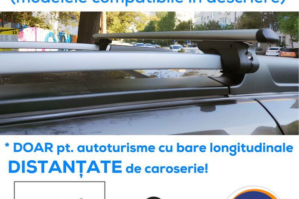 *** Bare Transversale Portbagaj cu cheie - ALUMINIU - 120 cm - Maxim 90 kg - Montaj pe longitudinale distantate (nelipite) *** Modelele compatibile sunt trecute mai jos, in descriere. 1) ATENTIE!!! Barele se monteaza doar pe autoturismele cu bare longitudinale DISTANTATE de caroserie!!! Barele se potrivesc DOAR pe modelul si tipul de caroserie mentionat in anunt (descriere si poza)! 2) Produsele sunt vandute de societate comerciala, sunt noi, sigilate! Sunt insotite de factura, termen de retur 14 zile lucratoare doar la produse nemontate/nefolosite. 3) Trimitem in tara prin FAN COURIER cu plata ramburs si verificare colet. 4) Setul de bare transversale cuprinde toate elementele necesare pentru montarea pe barele longitudinale ale autoturismului. Barele au sectiune aerodinamica si se potrivesc pentru toate tipurile de portbagaje (cutii portbagaj, suport bicicleta, suport schi, portbagaj caiac/canoe, etc.). Profilul barelor transversale ajuta la minimalizarea zgomotului si reduce rezistenta aerodinamica. Barele transversale sunt prevazute cu canal standard profil "T" de 14mm pentru montarea accesoriilor. Sistemul de bare contine: - 2 x Bare portbagaj din aluminiu - 4 x Sisteme de prindere pe barele longitudinale - 1 x Cheie imbus (nu este necesara o alta unealta) - 4 butuci antifurt - 2 chei Specificatii tehnice: - Lungimea barelor din set: 120 cm - Capacitate maxima de transport: pana la 90 kg ( 2 x 45 kg). - Inaltime bara: 2.80 cm - Latime bara: 4.80 cm - Material: ALUMINIU - Protectie antifurt cu cheie: DA. - Canal pe toata lungimea barei de 14 mm - Numar bare in set: 2 buc. - Culoare: Argintiu. - In conformitate cu DIN 75302 Modele compatibile: ALFA ROMEO 156 1996-2007 Combi AUDI A4 B5 1994-2001 Combi AUDI A4 B6 2000-2006 Combi AUDI A4 B7 2004->2008 Combi AUDI A4 B8 2008-2016 Allroad Avant AUDI A6 C5 1997-2004 Allroad Avant AUDI A6 C7 2011->2018 Allroad Avant BMW Seria 3 E36 1990-1997 Combi BMW Seria 3 E46 1997-2004 Combi BMW Seria 3 E91 2004-2008 Pre-Facelift Combi BMW Seria 5 E39 1995-2003 Combi BMW Seria 5 E61 2003-2010 Combi CHEVROLET Captiva I 2006-2019 CHEVROLET Cruze I 2011-2016 Facelift CHEVROLET Lacetti 2002-2009 Combi CHEVROLET Spark III (M300) 2009-2015 CITROEN C5 I (DC/DE) 2001-2007 Combi CITROEN C5 II (RD/TD) 2007-2019 Combi CUPRA Ateca 2016-prezent DACIA Dokker 2012-2021 (5 locuri) DACIA Duster I 2010-2013 Pre-Facelift DACIA Duster II 2018-2023 DACIA Jogger 2021-2023 Pre-Facelift DACIA Logan MCV I 2006-2012 DACIA Logan MCV II 2012-2020 DACIA Logan MCV Stepway 2013-2020 DACIA Sandero Stepway I 2008-2012 DACIA Sandero Stepway II 2012-2020 DACIA Sandero Stepway III 2020-prezent FIAT Croma II 2007-2010 Facelift FIAT Idea 2003-2012 FIAT Sedici 2005-2014 FORD Focus I 1998-2004 Combi FORD Focus II 2004-2010 Combi FORD Mondeo III 2000-2007 Combi FORD Mondeo IV 2007-2010 Pre-Facelift Combi FORD Tourneo Courier 2014-2023 FORD Transit Courier I 2014-2023 HYUNDAI i30 I 2006-2012 Combi HYUNDAI Santa Fe I 2000-2006 HYUNDAI Terracan 2004-2011 HYUNDAI Tucson I 2004-2009 JEEP Cherokee (KJ) 2002-2007 JEEP Grand Cherokee (WJ) 1999-2005 JEEP Patriot 2007-2017 KIA Carens I 1999-2006 KIA Carens II 2006-2013 KIA Carnival II 2005-2014 KIA Cee'd I 2006-2012 Combi KIA Sportage II 2004-2010 LAND ROVER Freelander I 1997-2006 LEXUS RX (AL10) 2008-2015 LEXUS RX (XU30) 2003-2009 MAZDA 5 II 2004-2010 MAZDA 6 II 2007-2012 Combi MAZDA 6 III 2012-prezent Combi MERCEDES Clasa C W203 2000-2007 Combi MERCEDES Clasa C W204 2008-2015 Combi MG ZS 2018-prezent MINI Countryman (F60) 2016-2023 MITSUBISHI Pajero Pinin 1998-2007 MITSUBISHI Pajero Pinin 1998-2007 MITSUBISHI Space Star 1999-2002 Pre-Facelift NISSAN Qashqai II (J11) 2013-2021 NISSAN X-Trail III (T32) 2013-2021 OPEL Agila A 2000-2007 OPEL Astra G 1998-2009 Combi OPEL Vectra B 1995-2002 Combi OPEL Zafira A 1999-2005 PEUGEOT 2008 I 2013-2019 PEUGEOT 206 1998-2013 Combi PEUGEOT 207 2006->2014 Combi PEUGEOT 307 2001->2008 Combi PEUGEOT 308 I 2007-2013 Combi PEUGEOT 406 1995-2007 Combi PEUGEOT 407 2004->2012 Combi RENAULT Clio III 2005-2014 Combi RENAULT Clio IV 2012-2020 Combi RENAULT Laguna I 1998-2001 Facelift Combi RENAULT Laguna II 2001-2008 Combi RENAULT Laguna III 2008-2015 Combi RENAULT Megane II 2002-2008 Combi RENAULT Megane III 2008-2016 Combi RENAULT Scenic III 2009-2015 SEAT Ateca 2016-prezent SEAT Exeo 2008-2013 Combi SKODA Fabia I 1999-2007 Combi SKODA Fabia II 2007-2014 Combi SKODA Fabia III 2014-2021 Combi SKODA Kamiq 2019-prezent SKODA Karoq 2017-prezent SKODA Kodiaq I 2017-2023 SKODA Octavia I 1996-2010 Combi SKODA Octavia II 2004-2013 Combi SKODA Octavia III 2013-2019 Combi SKODA Praktik 2006-2015 SKODA Roomster 2006-2015 SKODA Superb II 2008-2015 Combi SUBARU Forester V (SK) 2018-prezent SUBARU Impreza II 2000-2007 SUZUKI Grand Vitara 1998-2005 SUZUKI Ignis I 2000-2008 SUZUKI Ignis II 2016-prezent SUZUKI Jimny 1998-2018 SUZUKI SX4 S-Cross 2006-2012 SUZUKI Vitara XL 1998-2005 (7 locuri) TOYOTA Avensis I (T220) 1997-2002 Combi TOYOTA Avensis II (T250) 2003-2009 Combi TOYOTA Hilux VII 2004-2015 TOYOTA Land Cruiser Prado J120 2002-2009 TOYOTA Rav 4 (XA20) 2000-2005 TOYOTA Rav 4 (XA30) 2005-2012 VOLKSWAGEN Bora 1999-2006 Combi VOLKSWAGEN Caddy III 2003-2021 VOLKSWAGEN Cross Polo 2006-2009 VOLKSWAGEN Golf IV 1997-2004 Combi VOLKSWAGEN Golf Plus 2004-2008 VOLKSWAGEN Golf V 2003-2009 Combi VOLKSWAGEN Golf VI 2008-2012 Combi VOLKSWAGEN Golf VII 2012-2020 Combi VOLKSWAGEN Jetta V 2005-2010 Combi VOLKSWAGEN Passat B5 1997-2005 Combi VOLKSWAGEN Passat B6 2005-2010 Combi VOLKSWAGEN Passat B7 2010->2015 Combi VOLKSWAGEN T-Cross 2018-Prezent VOLKSWAGEN Tiguan I 2007-2016 VOLKSWAGEN Touareg I (7L) 2002-2010