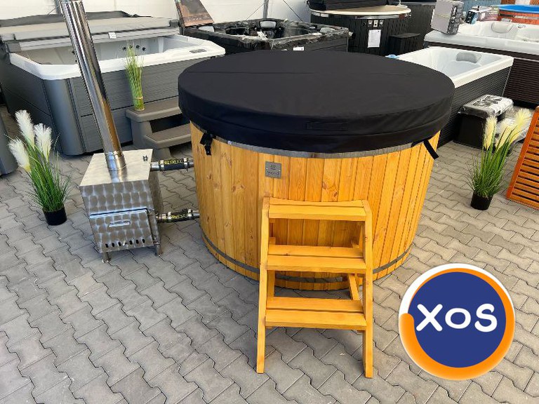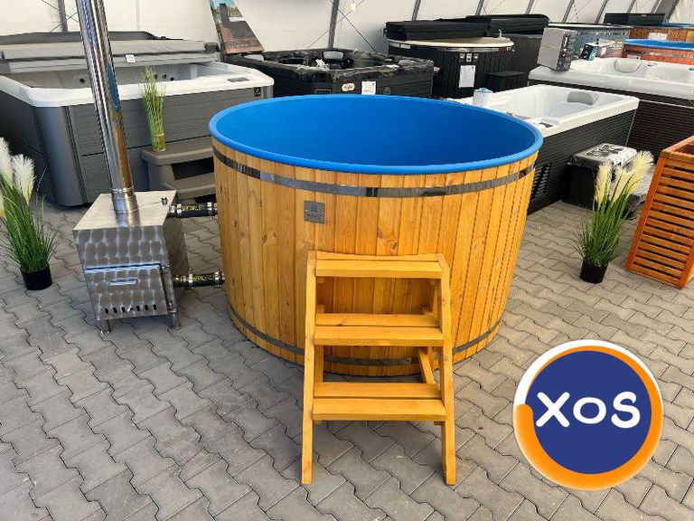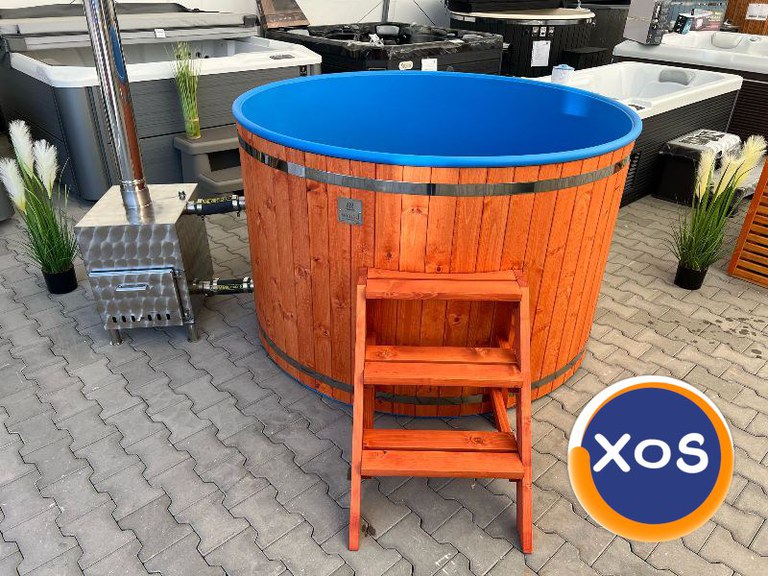 Dimensiuni: 168 cm*105 cm inaltime Capacitate: 4-6 persoane Lambriu pin nordic 12,5mm Calitate A Tratament dublu cu ulei de lemn Interior plastic PP, 6 mm Sobă exterioară, rezistență acid, 22 kw 2 m Cos de fum, inoxidabil Timp de încălzire 2-3 ore Băncuță interior plastic Scară exterioară cu 3 trepte Capac prelata, culoare Bej Culoare exterior la alegere: Nuc, Stejar Auriu, Cireș sau Antracit Optional: Capac izolat, grosimea 10 cm 1.375 RON TVA inclus Transport – pret in functie de locatie