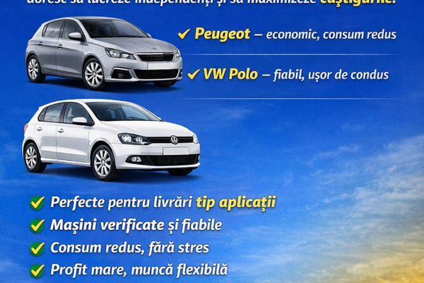 Închiriez autoturisme pentru livrări (Glovo / curierat) – contract legal 🚗 Mașini disponibile: • Peugeot – stare foarte bună, întreținere la zi • Volkswagen Polo – stare foarte bună, întreținere la zi ✔ Contract legal + RCA valabil ✔ Preț: XX lei / lună ✔ Perioadă minimă: X luni ✔ Plata se face prin contract / chitanță 📞 Contact: [Telefon] 📸 Poze reale ale mașinilor atașate Detalii suplimentare: • Mașinile pot fi folosite exclusiv pentru livrări / activități comerciale de curierat (Glovo, Tazz, Bolt etc.) • Se semnează contract de închiriere auto între proprietar și chiriaș • Persoane serioase, plata în avans sau conform contract Nr contact [Telefon]