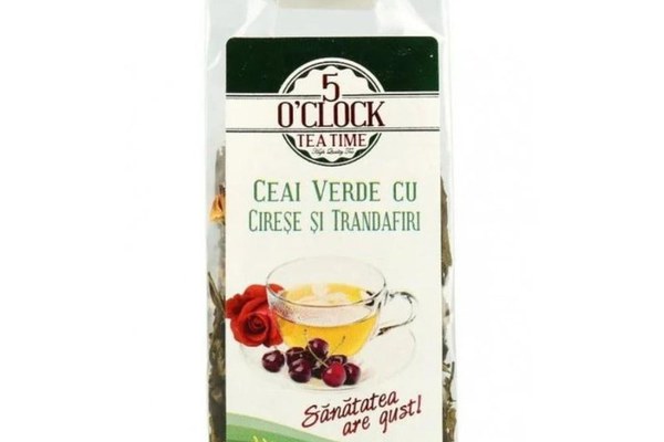 Ceaiul verde este cel mai apreciat de catre cunoscatorii de ceai, atat pentru gustul placut si delicat al infuziei, cat si pentru proprietatile pe care le prezinta. Iar cand ceaiul verde este imbogatit si cu bucati de fructe si petale de trandafiri, momentul savurarii unei cesti de ceai devine un adevarat spectacol al simturilor! Incearca 5 O'Clock Tea Ceai Verde cu Cirese si Trandafiri, un sortiment pe care sa-l savurezi atunci cand vrei sa te relaxezi in compania unei bauturi naturale, sau ori de cate ori simti nevoia sa te energizezi. Ingrediente: ceai verde Sencha, ceai verde cu iasomie, cirese, macese, arome, petale de iasomie, bujori si trandafir. Tara de provenienta a ingredientului principal: China. Produs in UE. Merge cu: deserturi usoare Recomandari de servire: Iti recomandam sa consumi neindulcit, pentru a te bucura de aroma naturala a ceaiului Mod de Preparare: Pentru a prepara o ceasca de ceai, adaugati apa fierbinte ( 70?C) peste o lingurita cu ceai (aproximativ 2 gr) si lasati la infuzat timp de 2-3 minute. Dozaj portie 2 grame Temperatura apa 70°C Timp de preparare 2-3 minute Valori nutritionale Per 100g Nivel teina Energie (kj/kcal) 18/4 Grasimi 0g din care acizi grasi saturati 0g Carbohidrati 0g din care zaharuri 0g Proteine 0g Sare 0.03g
