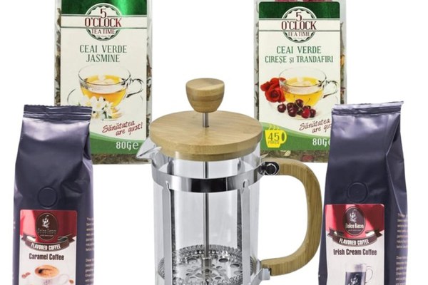 Aroma Energy Brew este pachetul perfect pentru cei care iubesc gusturile intense și variate. Creat pentru a aduce echilibru între rafinamentul ceaiului verde și aroma bogată a cafelei, acest set te ajută să-ți începi ziua cu energie și să o închei cu o pauză savuroasă. Ce conține pachetul: Bamboo TeaBew – French Press 5 O’Clock Tea (600 ml) 5 O’Clock Tea Ceai Verde Jasmine – 80 g 5 O’Clock Tea Ceai Verde cu Cireșe și Trandafiri – 80 g DolceBacio Coffee Irish Cream – 125 g DolceBacio Coffee Caramel – 125 g De ce îți va plăcea: Pachet versatil care combină ceai și cafea – ideal pentru toți iubitorii de băuturi aromate. French Press-ul Bamboo TeaBew permite prepararea atât a ceaiului, cât și a cafelei, oferind o extracție uniformă și un gust plin. Ceaiurile verzi aduc prospețime și note florale delicate, perfecte pentru dimineți liniștite. Cafelele DolceBacio completează experiența cu arome de caramel și Irish Cream – fine, dulci și catifelate. Ideal pentru birou, pentru acasă sau ca un cadou elegant, cu gust rafinat. Recomandare de preparare: Pentru ceai: 1–2 g frunze/250 ml, apă la 80°C, infuzie 2–3 minute. Pentru cafea: 8–10 g/150 ml apă fierbinte (95°C), lasă 4 minute înainte de a apăsa pistonul. French Press-ul poate fi folosit zilnic, atât pentru infuzii ușoare, cât și pentru prepararea cafelei cremoase. Aroma Energy Brew – un kit dedicat celor care caută aromă, echilibru și energie într-o formă elegantă și naturală.
