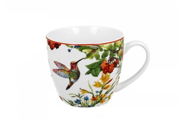 Cana fabricata din porțelan de înaltă calitate de culoare albă, decorat cu un motiv floral și cu o pasăre paradisiacă. Totul este ambalat într-un ambalaj original cu mânere, fiind o idee excelentă pentru un cadou. Carateristici: Diametru: 10,2 cm Înălțime: 9,5 cm Capacitate: 460 ml Material: Porțelan Potrivit pentru mașina de spălat vase: DA Potrivit pentru cuptorul cu microunde: DA