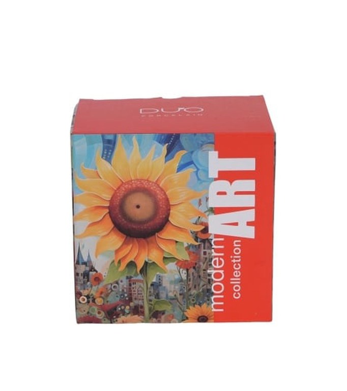 Confecționată din porțelan New Bone China , cana SUNFLOWER se distinge prin nuanța sa alb-crem natural, cu o strălucire fină. Este în același timp rezistentă și durabilă, dar delicată și ușoară, oferind un rafinament aparte fiecărui moment de relaxare. Grație infuzorului inclus, este ideală pentru a prepara ceaiuri aromate și infuzii din plante parfumate. Decorul surprinde un motiv plin de fantezie: un câmp de floarea-soarelui și flori delicate ce se îmbină cu peisajul unui oraș modern. Galbenul intens și roșul florilor se contopesc cu albastrul cerului și cu atmosfera futuristă, dând naștere unui cadru magic ce invită la visare și inspirație. Acest motiv extraordinar stimulează imaginația și te îndeamnă să descoperi frumusețea din viața de zi cu zi. Produsul este ambalat într-o cutie decorativă cu același motiv, ceea ce îl face un cadou inspirat pentru o persoană dragă, un suvenir original pentru iubitorii de frumos și detalii rafinate. Este potrivit pentru orice ocazie și aduce o notă de bucurie fiecărui moment petrecut cu o cafea sau un ceai aromat. Colecția MODERN te invită într-o lume de poveste, unde magia, visul și imaginația se împletesc liber.