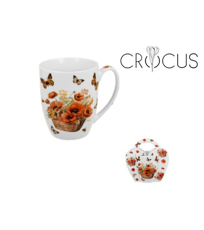 Confecționată din porțelan New Bone China , această cană se remarcă prin durabilitatea excelentă și aspectul său lucios, alb-crem, elegant și rafinat. Decorul prezintă un coșuleț împletit plin cu maci roșii de câmp, care transmit bucurie și vitalitate. Fluturii și albinele din jurul compoziției adaugă un plus de dinamism și delicatețe. Mugurii de mac subtili din fundal pun în valoare eleganța întregului model. Ambalată într-o cutie decorativă cu același motiv, cana reprezintă o idee de cadou original și rafinat. Această colecție de căni și cești poate fi și o frumoasă decorațiune pentru bucătărie sau sufragerie, iar varietatea de forme și capacități face ca fiecare să găsească ceva potrivit pentru sine.