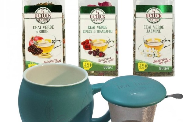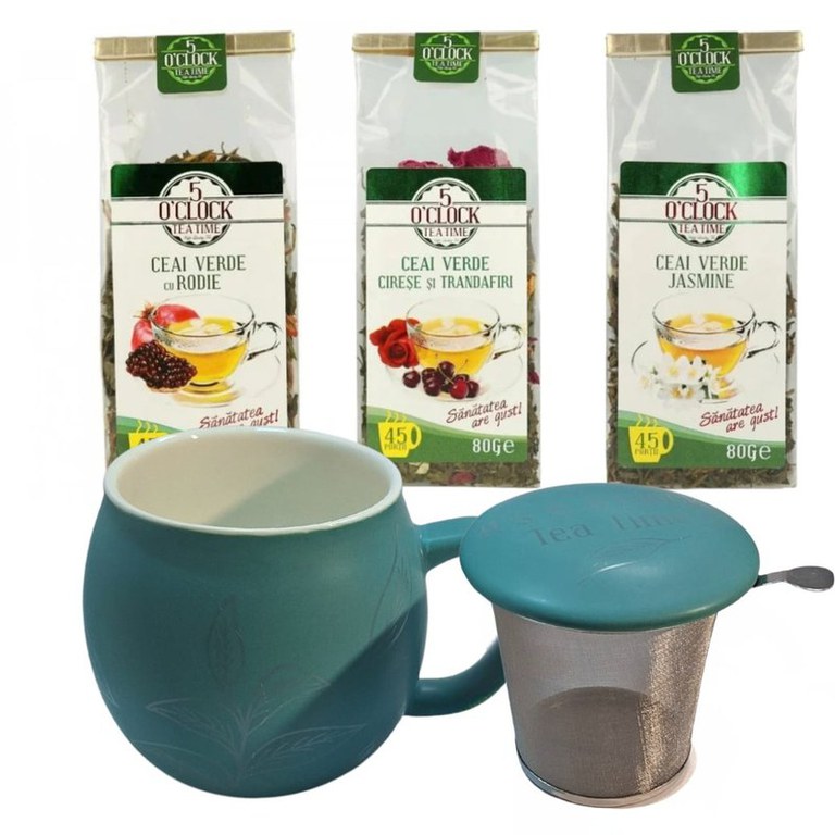 Echilibru Verde este despre un ritm mai așezat al zilei. O cană pregătită ușor, arome curate și infuzii care se beau cu atenție, nu pe fugă. Un ritual simplu, potrivit pentru momentele în care vrei claritate, fără intensitate excesivă. Ce conține pachetul– 5 O’Clock Tea Ceai Verde cu Rodie, 80 g – Gust proaspăt, cu o notă ușor fructată, potrivit pentru pauze active sau început de zi.– 5 O’Clock Tea Ceai Verde Cireșe și Trandafiri, 80 g – O combinație delicată, cu aromă florală discretă, pentru momente mai calme.– 5 O’Clock Tea Ceai Verde Jasmine, 80 g – Clasic și echilibrat, cu parfum fin de iasomie, ușor de integrat într-un obicei zilnic.– Cană din ceramică cu infuzor – Gândită pentru prepararea ceaiului vrac direct în cană, simplu și ordonat, fără accesorii în plus. De ce funcționează bine împreunăSelecția de ceaiuri verzi oferă varietate fără să iasă din aceeași zonă de gust și stare. Cana cu infuzor face prepararea rapidă și constantă, astfel încât ritualul să rămână ușor de repetat. Este un pachet coerent, construit pentru continuitate, nu pentru ocazii rare. Pentru cine este potrivit– Pentru persoane care vor să introducă ceaiul verde în rutina zilnică, fără complicații.– Pentru pauze la birou, când ai nevoie de o băutură ușoară și clară.– Pentru acasă, ca ritual de dimineață sau după-amiază.– Ca idee de cadou pentru cineva care apreciază gusturile echilibrate și obiectele utile. Un set simplu și bine legat, care susține un obicei calm și ușor de păstrat.