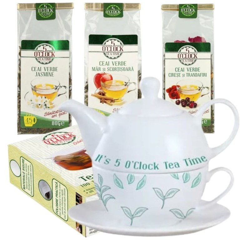 Green Tea Lover’s Kit este pachetul ideal pentru cei care iubesc finețea și prospețimea ceaiului verde. Fiecare sortiment din acest set a fost ales pentru a oferi o experiență completă — de la note florale de iasomie până la dulceața discretă a mărului și parfumul elegant al trandafirilor. Ce conține pachetul: Tea for One „It’s Tea Time” – set ceramic elegant (380 ml + 320 ml) 5 O’Clock Tea Ceai Verde Jasmine – 80 g 5 O’Clock Tea Ceai Verde cu Cireșe și Trandafiri – 80 g 5 O’Clock Tea Ceai Verde cu Măr și Scorțișoară – 80 g Filtre nețesute – 100 bucăți/cutie De ce îți va plăcea: O combinație echilibrată între ceaiuri verzi florale și ușor fructate, potrivite pentru orice moment al zilei. Setul Tea for One îți permite să prepari rapid și elegant o porție perfectă de ceai, păstrând aroma autentică a frunzelor. Filtrele incluse asigură o infuzie curată și clară, fără resturi în ceașcă. Este o alegere inspirată pentru un cadou elegant sau pentru propriul tău moment de relaxare. Recomandare de preparare: Folosește 1–2 g de ceai pentru 250 ml de apă la temperatura de 75–85°C. Lasă 2–3 minute la infuzat. Pentru o aromă mai intensă, poți re-infuziona frunzele o dată. Un set care aduce liniște, echilibru și prospețime – exact esența unui ceai verde de calitate.