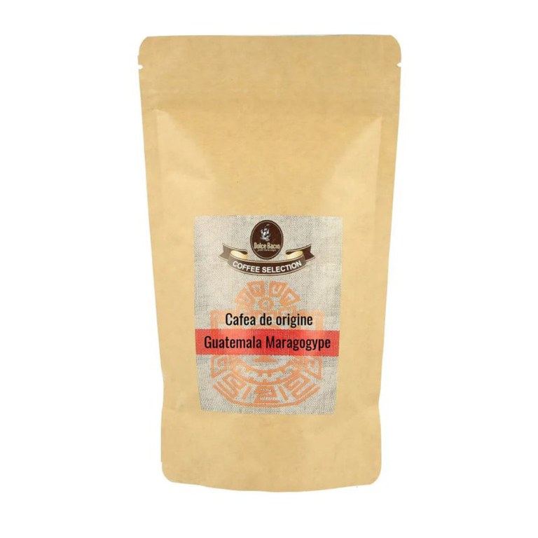 Este un sortiment de cafea provenit din plantatii din Guatemala unde micii fermieri au o experienta indelungata, ei cultivand cafea inca din anul 1850. In prezent, regiunea cunoaste o rasunatoare evolutie din punct de vedere economic, cafeaua provenita din Guatemala fiind din ce in ce mai indragita de catre cunoscatorii de cafea din intreaga lume. Maragogype este denumirea tipului de arbori de cafea ce se cultiva in aceasta zona, inseamnand "boabe elefant", care se remarca prin dimensiunea acestora si prin faptul ca au in mod natural un nivel de cofeina ceva mai redus. Predomina notele florale si de citrice, iar retrogustul prezinta note de coacaze negre. Guatemala Maragogype are o aciditate echilibrata, fiind ideal de savurat in special dimineata. Ingrediente: cafea 100% Arabica de origine Guatemala. Mod de preparare: Pentru o ceasca de cafea, folositi minim 2 lingurite de cafea macinata (aprox. 7gr). Recomandari de servire: Poate fi consumata ca atare sau in combinatie cu lapte, frisca sau spuma de lapte pentru varianta mai cremoasa. Prajire Usoara Cofeina Ridicata Aciditate medie Recomandari de preparare Ibric Espressor Filtru Cafetiera Moka French Press Valori nutritionale Per 100g Energie (kj/kcal) Grasimi 0g din care acizi grasi saturati 0g Carbohidrati 0g din care zaharuri 0g Proteine 0g Sare 0g