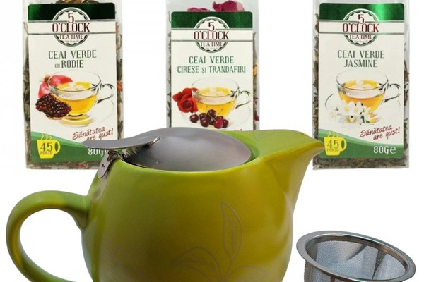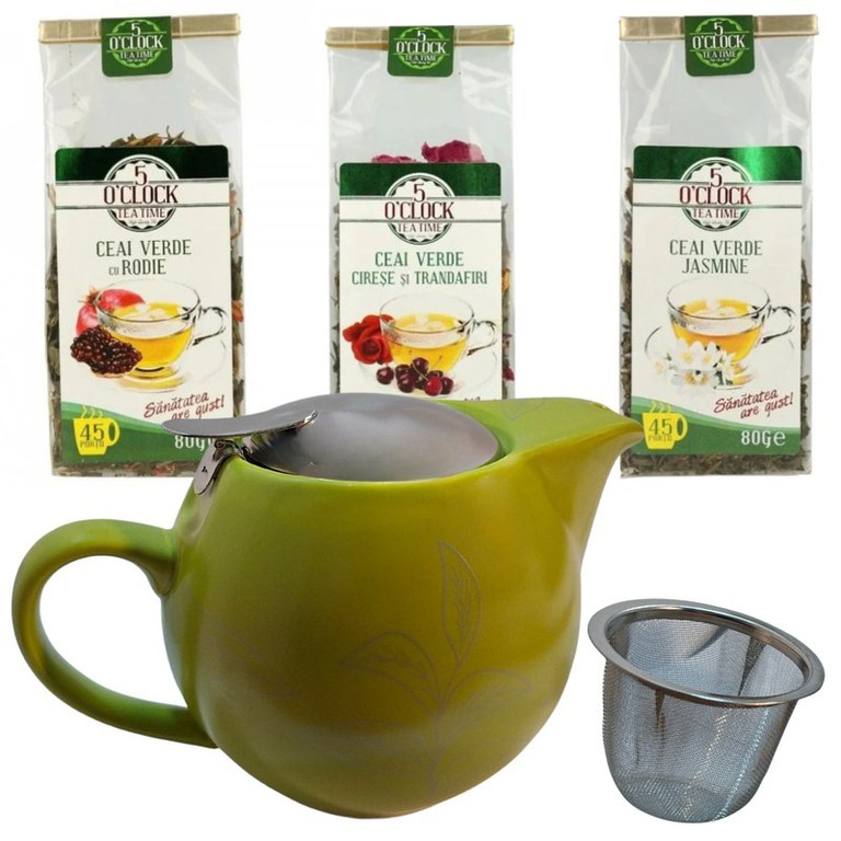 Infuzie Verde este despre ritm, claritate și pauze care chiar se simt. Ceaiul se prepară încet, se toarnă calm și se savurează fără grabă. Un set gândit pentru momentele în care vrei să rămâi prezent și să păstrezi lucrurile simple. Ce conține pachetul– 5 O’Clock Tea Ceai Verde cu Rodie, 80 g – O infuzie proaspătă, cu note ușor fructate, potrivită pentru începutul zilei sau pauze active.– 5 O’Clock Tea Ceai Verde Cireșe și Trandafiri, 80 g – Gust echilibrat, cu accente florale discrete, ideal pentru momente mai liniștite.– 5 O’Clock Tea Ceai Verde Jasmine, 80 g – Un ceai clasic, cu aromă fină de iasomie, ușor de integrat într-o rutină zilnică.– Ceainic din ceramică verde cu infuzor – Creat pentru prepararea ceaiului vrac în cantitate mai mare, astfel încât să te bucuri de mai multe cești dintr-o singură infuzie. De ce funcționează bine împreunăCeainicul susține un ritual mai așezat, iar selecția de ceaiuri verzi oferă varietate fără să iasă din aceeași zonă de gust. Fiecare infuzie completează experiența, fără schimbări bruște sau decizii complicate. Este un pachet construit pentru consecvență și simplitate. Pentru cine este potrivit– Pentru cei care preferă ceaiul verde și vor să îl bea constant.– Pentru pauze la birou sau acasă, când ai nevoie de un ritual previzibil.– Pentru persoane care apreciază gusturi curate și obiecte funcționale.– Ca idee de cadou echilibrată, ușor de oferit și ușor de folosit. Un set coerent, gândit pentru pauze care aduc ordine și claritate în zi.