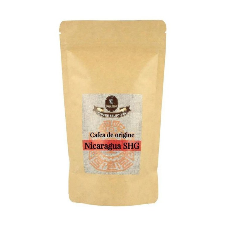 Una dintre cele mai bune cafele din lume este cea de origine Nicaragua. SHG inseamna "Strictly High Grown", arborii de cafea fiind crescuti doar la altitudini inalte. Aceasta cafea se remarca prin aciditatea placuta si notele fructate. Datorita aciditatii placute se poate consuma chiar si dimineata la micul dejun. 18+ se refera la marimea boabelor, cu cat acestea se coc in mai mult timp si devin mai mari si prezinta un gust mai interesant. Cafeaua de origine Nicaragua se remarca prin notele dulci, florale, amestecate cu cele de ciocolata. Prezinta o aciditate destul de ridicata, de citrice. Ingrediente: cafea 100% Arabica de origine Nicaragua. Mod de preparare: Pentru o ceasca de cafea, folositi minim 2 lingurite de cafea macinata (aprox. 7gr). Recomandari de servire: Poate fi consumata ca atare sau in combinatie cu lapte, frisca sau spuma de lapte pentru varianta mai cremoasa. Prajire Mediu Cofeina Ridicata Aciditate ridicata Recomandari de preparare Ibric Espressor Filtru Cafetiera Moka French Press Valori nutritionale Per 100g Energie (kj/kcal) Grasimi 0g din care acizi grasi saturati 0g Carbohidrati 0g din care zaharuri 0g Proteine 0g Sare 0g