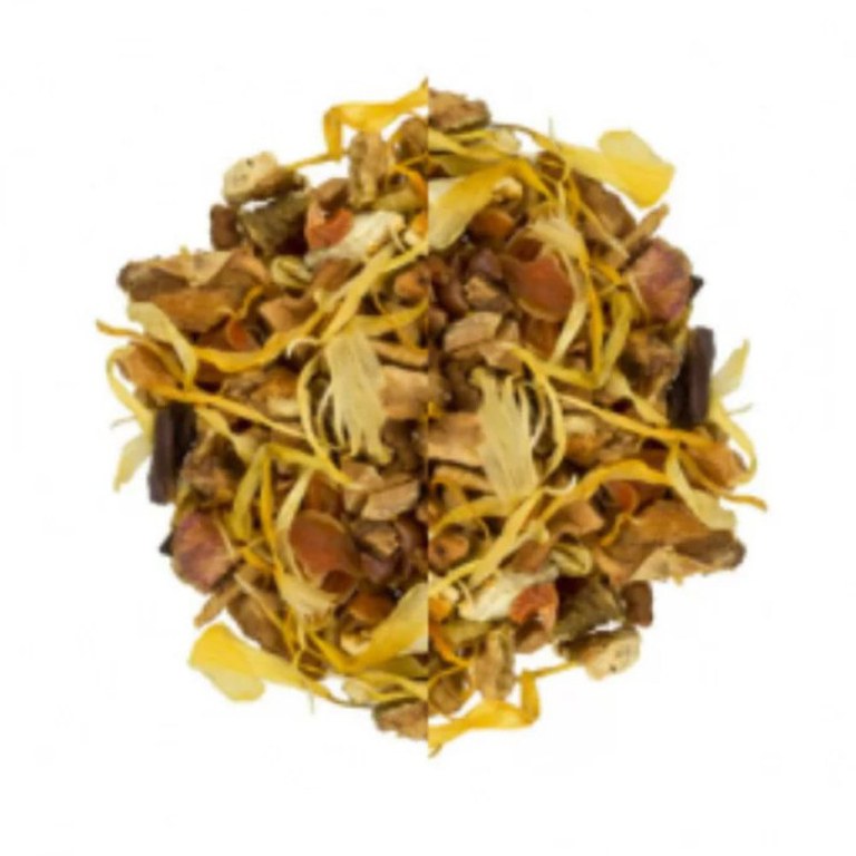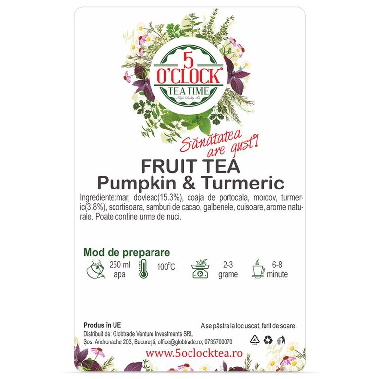 O infuzie de fructe fara hibiscus, o fuziune neobisnuita de dovleac dulce, turmeric si condimente. Acesta nu contine teina, motiv pentru care poate fi consumat chiar si seara. Se poate servi atat rece cat si fierbinte. Ingrediente: mar, dovleac(15.3%), coaja de portocala, morcov, turmeric(3.8%), scortisoara, samburi de cacao, galbenele, cuisoare, arome naturale. Poate contine urme de nuci. Produs in UE. Merge cu: tarte, cheesecake, salata de fructe. Recomandari de servire: Pentru a imbogati si mai mult gustul adauga o felie de lamaie sau de portocala, sau putina scortisoara. Mod de Preparare: Pentru a prepara o ceasca de ceai, adaugati apa fierbinte ( 100°C) peste o lingurita cu ceai (aproximativ 3 gr) si lasati la infuzat timp de 6-8 minute. Pentru Ice Tea folositi o cantitate dubla de ceai (6 grame) si adaugati cuburi de gheata dupa infuzare. Dozaj portie 3 grame Temperatura apa 100°C Timp de preparare 6-8 minute Valori nutritionale Per 100g Nivel teina Energie (kj/kcal) 18/4 Grasimi 0g din care acizi grasi saturati 0g Carbohidrati 0g din care zaharuri 0g Proteine 0g Sare 0.03g
