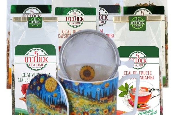 Tea Lover Kit by 5 O’Clock Tea este pachetul creat special pentru pasionații de ceaiuri autentice și aromate. Cu o selecție de 6 sortimente variate și o cană premium cu infuzor, acest kit îți oferă experiența completă a momentelor de relaxare, fie că savurezi o infuzie caldă într-o zi răcoroasă, fie că te bucuri de un iced tea revigorant. Conținut Pachet: Cana Sunflower Field cu capac și infuzor inox, 450 ml – Porțelan New Bone ChinaElegantă și rezistentă, cana impresionează prin designul său spectaculos: un câmp de floarea-soarelui sub un cer albastru intens, ce aduce o notă de inspirație și magie fiecărui moment. Prevăzută cu infuzor din inox, este ideală pentru prepararea rapidă și ușoară a ceaiurilor preferate. Ambalată într-o cutie decorativă, devine și un cadou rafinat. 5 O’Clock Tea Rooibos cu Măr și Migdale (80 g) – Rooibos fără teină, cu note dulci și calde, perfect pentru serile liniștite. 5 O’Clock Tea Rooibos cu Căpșuni și Trandafiri (80 g) – O combinație delicată și parfumată, ideală pentru o infuzie relaxantă și aromată. 5 O’Clock Tea Ceai Verde cu Rodie (80 g) – Ceai verde energizant, cu note fructate de rodie, bogat în antioxidanți și potrivit atât cald, cât și rece. 5 O’Clock Tea Ceai Verde cu Măr și Scorțișoară (80 g) – Un ceai verde reconfortant, unde prospețimea merelor se completează cu aroma caldă a scorțișoarei. 5 O’Clock Tea Fructe de Soc și Trandafir (80 g) – Infuzie floral-fructată, cu note dulci-acrișoare, ideală pentru momente de răsfăț. 5 O’Clock Tea Fructe de Pădure (80 g) – Aromă intensă și colorată, plină de prospețimea fructelor de pădure, excelentă și ca iced tea. De ce să alegeți Tea Lover Kit? ? Experiență completă – 6 sortimente variate, de la rooibos delicat la ceai verde energizant și infuzii fructate.? Eleganță și funcționalitate – Cana Sunflower Field cu infuzor transformă fiecare preparare într-un moment de răsfăț.? Cadoul perfect – Un pachet ambalat festiv, gata să fie dăruit celor dragi sau păstrat pentru bucuria ta zilnică. Cum să preparați ceaiurile fierbinți cu Tea Lover Kit: Adaugă ceaiul preferat: Pune 1-2 lingurițe în infuzorul de inox al cănii Sunflower Field. Adaugă apă fierbinte: Toarnă apă la 80–100°C (în funcție de tipul de ceai). Infuzează: Acoperă cana și lasă 5–7 minute pentru a dezvolta aromele. Savurează: Bucură-te de un ceai cald și plin de gust. Cum să preparați ceaiurile reci (Iced Tea) cu Tea Lover Kit: – Folosește o cantitate dublă de ceai pentru o infuzie concentrată.– Prepară ceaiul fierbinte conform pașilor de mai sus.– Adaugă multă gheață și felii de fructe proaspete.– Obții o băutură naturală, aromată și revigorantă. Concluzie: Cu Tea Lover Kit by 5 O’Clock Tea, fiecare zi devine mai plăcută și mai aromată. Este pachetul ideal pentru iubitorii de ceaiuri de calitate, combinând varietatea gusturilor cu eleganța unei căni premium. ?
