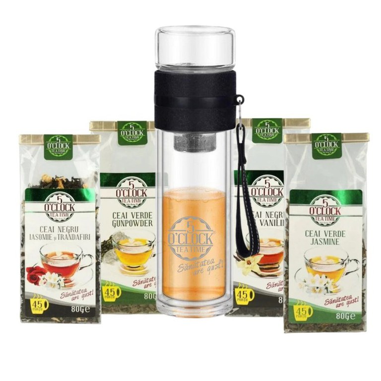 Winter Warmth Vitality Kit by 5 O'Clock Tea este pachetul ideal pentru zilele reci, oferind o selecție de ceaiuri verzi și negre aromate care te încălzesc și îți oferă o senzație de confort și vitalitate. Sticla premium cu infuzor BrewTravel din acest pachet îți permite să te bucuri de ceaiuri fierbinți oriunde ai fi, fie că ești la birou, acasă, sau într-o excursie de iarnă. BrewTravel Infuser Bottle Sticla BrewTravel de la 5 O'Clock Tea este concepută pentru a transforma fiecare ceașcă de ceai într-un moment de plăcere și relaxare. Realizată din sticlă borosilicată durabilă, cunoscută pentru rezistența sa la temperaturi ridicate, și echipată cu un infuzor din oțel inoxidabil, această sticlă asigură o infuzare uniformă și completă a frunzelor de ceai, păstrând gustul autentic. Capacul ermetic previne scurgerile, astfel încât să o poți lua oriunde, iar designul ergonomic o face extrem de confortabilă pentru utilizarea zilnică. Este sticla ideală pentru cei care apreciază stilul și confortul, fără a compromite funcționalitatea. Ce conține Winter Warmth Vitality Kit: 5 O'Clock Tea Iasomie și Trandafiri (80g) – Acest ceai fin combină notele delicate ale iasomiei și trandafirilor, oferindu-ți o infuzie caldă și florală, ideală pentru momente de relaxare. 5 O'Clock Tea Ceai Negru cu Vanilie (80g) – Un ceai negru bogat și intens, îmbogățit cu o notă subtilă de vanilie, perfect pentru a te încălzi și a-ți oferi o doză de energie în zilele reci de iarnă. 5 O'Clock Tea Gunpowder (80g) – Acest ceai verde robust și intens este ideal pentru a-ți reîncărca energia, oferind o infuzie puternică, plină de antioxidanți, potrivită pentru a te încălzi și revitaliza. 5 O'Clock Tea Ceai Verde Jasmine (80g) – Cu aroma sa proaspătă și delicată de iasomie, acest ceai verde este o alegere perfectă pentru o infuzie reconfortantă, ușoară, care îți aduce o stare de bine în timpul iernii. De ce să alegi Winter Warmth Vitality Kit? Energie naturală: Ceaiurile negre din acest kit îți vor oferi energia necesară pentru a face față zilelor aglomerate, oferindu-ți o senzație de claritate și concentrare. Ritual de detoxifiere: Ceaiurile verzi contribuie la un proces natural de detoxifiere, oferindu-ți o stare de revigorare și susținându-ți bunăstarea generală. Aromă și căldură: Cu arome naturale și fără adaosuri artificiale, fiecare ceașcă din acest pachet aduce o explozie de gusturi autentice care îți vor încălzi sufletul și corpul. Cum să prepari ceaiurile fierbinți cu BrewTravel: Adaugă ceaiul preferat: Pune 1-2 lingurițe de ceai din pachetul Winter Warmth Vitality Kit în infuzorul din oțel inoxidabil al sticlei BrewTravel. Adaugă apă fierbinte: Toarnă apă fierbinte (aproximativ 90°C pentru ceai verde și 100°C pentru ceai negru) în sticlă. Infuzează: Închide sticla și lasă ceaiul la infuzat timp de 3-5 minute, în funcție de tipul de ceai ales și de intensitatea dorită. Savurează: Bucură-te de o băutură fierbinte, plină de aromă și beneficii. Concluzie Cu Winter Warmth Vitality Kit , îți poți transforma rutina de iarnă într-un ritual cald și confortabil, alături de ceaiuri autentice și sticla BrewTravel, care îți oferă libertatea de a savura infuzii aromate oriunde te afli. Fiecare ceașcă este o explozie de gust natural, oferind o hidratare sănătoasă și o senzație de bunăstare în zilele reci.