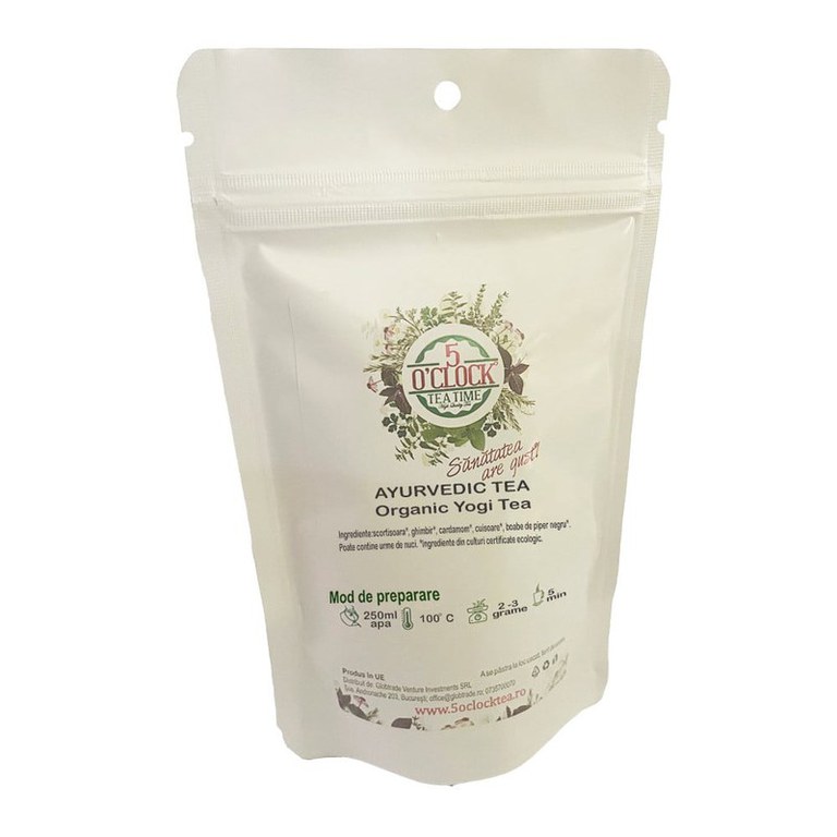 Pasionatii de Ayurveda cunosc importanta ceaiurilor pentru sanatatea corpului si a mintii. Yogi este o infuzie revigoranta preparata numai din ingrediente certificate organic, perfecta pentru pauzele pe care le iei in activitatea ta zilnica si pe care le folosesti pentru a-ti gasi echilibrul in viata. Ingrediente: scortisoara*, ghimbir*, cardamom*, cuisoare*, boabe de piper negru*. Poate contine urme de nuci. *Ingrediente din culturi certificate ecologic.Produs in UE. Merge cu: deserturi pe baza de fructe. Recomandari de servire: Pentru a imbogati si mai mult gustul adauga o felie de lamaie sau de portocala, sau putina scortisoara. Mod de Preparare: Pentru a prepara o ceasca de ceai, adaugati apa fierbinte ( 100°C) peste o lingurita cu ceai (aproximativ 2-2.5 gr) si lasati la infuzat timp de 8-10 minute. Dozaj portie 2-2.5 grame Temperatura apa 100°C Timp de preparare 8-10 minute Valori nutritionale Per 100g Nivel teina Energie (kj/kcal) 0/0 Grasimi 0g din care acizi grasi saturati 0g Carbohidrati 0g din care zaharuri 0g Proteine 0g Sare 0g