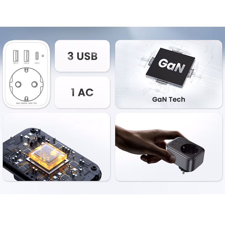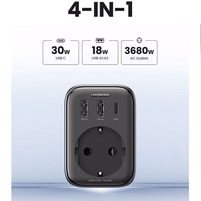 Adaptor multifunctional UGREEN CD314 cu priza AC, USB-C si USB-A – Incarcare rapida si sigura, oriunde te afli UGREEN CD314 este adaptorul compact si versatil care iti ofera energie pentru toate dispozitivele, fie ca esti acasa, la birou sau in calatorii. Echipat cu o priza AC Schuko (max. 3680W), 2 porturi USB-A si 1 port USB-C de 30W, poate incarca simultan laptopuri, telefoane, tablete si alte gadgeturi, economisind timp si spatiu. ✔ USB-C 30W Fast Charging – compatibil cu PD 3.0, QC 4+, PPS si alte standarde moderne ✔ 3 in 1 – priza AC, USB-A si USB-C intr-un singur dispozitiv compact ✔ Tehnologie GaN – eficienta energetica ridicata si disipare termica redusa ✔ Protectii inteligente – impotriva suprasarcinii, supratensiunii si scurtcircuitului ✔ Design portabil si carcasa ignifuga – siguranta si durabilitate pe termen lung Fiabil, usor de transportat si construit pentru performanta, UGREEN CD314 ofera incarcare rapida si sigura pentru toate nevoile tale de zi cu zi. Adaptorul UGREEN 30W Outlet Extender EU (2A1C) CD314 are urmatoarele caracteristici: Material: policarbonat ignifug; Mufe: 2x USB-A, 1x Type-C; Putere maxima priza AC: 3680W Curent maxim priza AC: 16A; Tensiune priza AC: 250V AC; Intrare curent Type-C: 5V/3A, 9V/3A, 14V/2.5A, 15V/2A, 20V/1.5A; Putere Type-C: PD30W; PPS Type-C: 3.3-11V/2.75A; Intrare curent USB-A: 5V/3A, 9V/2A, 12V/1.5A; Putere maxima USB-A: 18W (fiecare) Putere 2 sau 3 porturi USB: 15.5W (5V/3.1A); Dimensiuni: 8 x 5.5 x 4.3 cm; Greutate: 147.7g. Incarcare rapida a dispozitivelor Cu adaptorul UGREEN 30W Outlet Extender EU CD314, iti poti reincarca rapid echipamentele. Suporta protocolul de incarcare rapida PD de pana la 30W, permitand alimentarea eficienta a dispozitivelor compatibile. De exemplu, un iPhone 14 ajunge la 50% in doar 30 de minute, iar un Xiaomi 11 se incarca pana la 52% in acelasi interval. Compatibilitate extinsa Adaptorul UGREEN 30W Outlet Extender EU CD314 este conceput pentru a functiona fiabil cu o gama variata de dispozitive, asigurand compatibilitate si siguranta in utilizare. Poate alimenta fara probleme televizoare, calculatoare, ventilatoare sau proiectoare, fiind la fel de util si in bucatarie pentru aparate precum cuptor cu microunde, fierbator electric sau frigider. Siguranta in utilizare Adaptorul UGREEN 30W Outlet Extender EU CD314 ofera siguranta si confort in utilizare, fiind o alegere practica pentru acasa sau birou. Tehnologia moderna pe baza de nitrura de galiu (GaN) asigura eficienta energetica ridicata, consum redus si un design compact si portabil. Dispozitivul include protectii avansate impotriva supratensiunii, suprasarcinii, supraincalzirii, supracurentului si scurtcircuitului, garantand functionare stabila si fiabila pe termen lung. Perfect pentru calatorii Cu o greutate de doar 147,7 g si dimensiuni compacte de 8 x 5.5 x 4.3 cm, se potriveste cu usurinta intr-o geanta de mana, rucsac sau valiza. In plus, fiind compatibil cu tensiuni intre 100 si 250 V, il poti folosi fara probleme si in strainatate. Vezi si Politica de Returnare.
