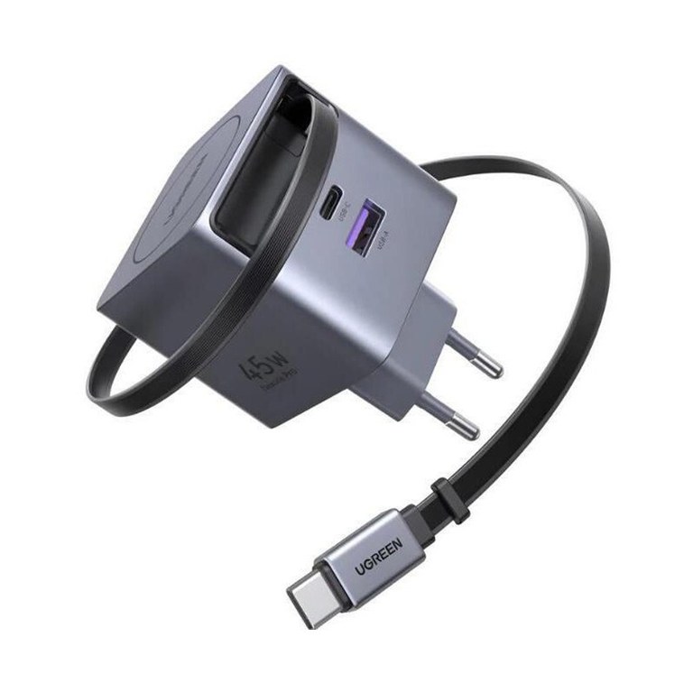 Incarcator rapid cu cablu retractabil UGREEN 45W GaN Fast Charger X614, 2 x USB C + 1 x USB A, Gri