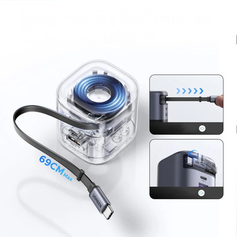 Incarcator rapid cu cablu retractabil UGREEN 45W GaN Fast Charger X614 - Descriere Incarcare rapida cu cablu retractabil Cablul USB-C auto-retractabil de aprox 0,69 m ofera incarcare instant, fara cabluri incurcate. Ideal atat pentru utilizare acasa, cat si in deplasare, cand ai nevoie de ordine si acces rapid. Incarcare ultra-rapida de 45W Portul USB-C, impreuna cu cablul PPS-5A, permite incarcare rapida Super Fast Charging 2.0, ajungand pana la 67% baterie pentru Galaxy S25 Ultra in aproximativ 30 de minute. Nota: cablul retractabil suporta incarcare maxima de pana la 25W. Design compact 3-in-1 Incarca simultan pana la 3 dispozitive si inlocuieste mai multe incarcatoare cu o singura solutie compacta si eficienta, potrivita pentru birou, casa sau calatorii. Protectie avansata cu tehnologie GaN Tehnologia GaNInfinity integreaza un sistem de siguranta in 8 niveluri, cu eficienta energetica de pana la 95%, disipare redusa a caldurii si un format compact, gandit pentru utilizare zilnica in siguranta. Compatibilitate universala Suporta protocoale PD, QC si PPS, fiind compatibil cu Galaxy S25, S24, S23, seriile iPhone 16 si 15, iPad si multe alte dispozitive moderne. Incarcator rapid cu cablu retractabil UGREEN 45W GaN Fast Charger X614 are urmatoarele caracteristici: Putere maxima de pana la 45W; 3 porturi (2x USB-C + 1x USB-A); Tehnologie GaN; Protectie avansata; Dimensiune cablu retractabil aprox 69 cm; Conexiunea prin cablu este USB-C; Design compact si portabil. Cablu USB-C retractabil de 69 cm Compact si portabil Un accesoriu esential pentru deplasari Simplifica incarcarea, fara cabluri incurcate Incarcator rapid cu cablu retractabil UGREEN 45W GaN Fast Charger X614 - Compatibilitate extinsa Nota: cablul nu suporta Super Fast Charging 2.0 45W 3-IN-1 Incarcare simultana pentru 3 dispozitive Incarcator rapid cu cablu retractabil UGREEN 45W GaN Fast Charger X614 - 45W Super Fast Charging maxim Nota: portul USB-C poate atinge Super Fast Charging 2.0 de 45W cu un cablu de incarcare PPS 5A Extindere Tehnologie GaN inteligenta Vezi si Politica de Returnare.