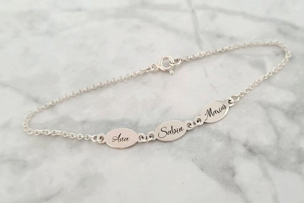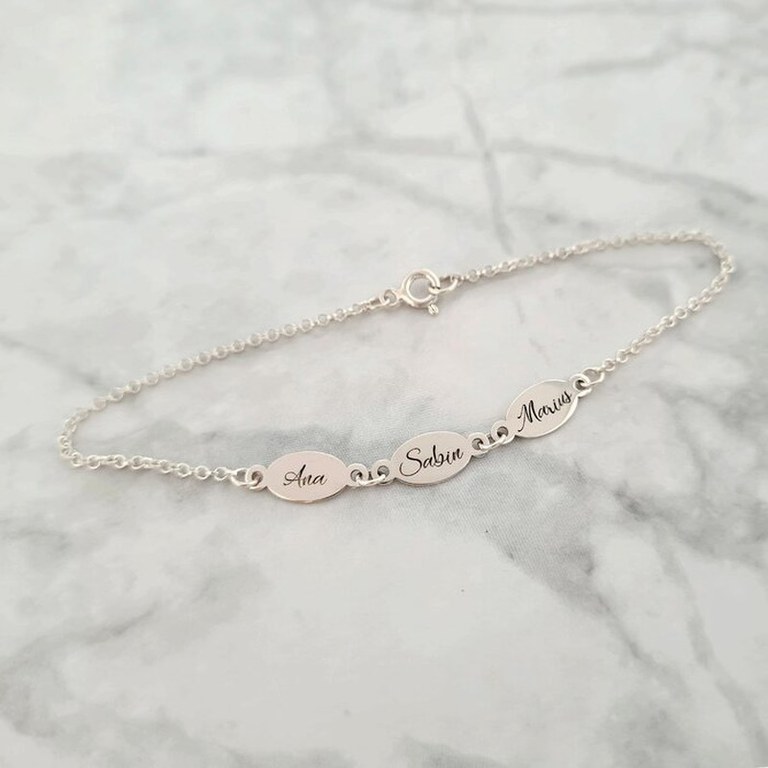 Poti alege sa personalizeze aceasta bratara adaugand propriul nume, numele persoanei iubite, numele copiilor, a celor dragi, a animalelor de companie sau chiar oricare 3 cuvinte semnificative. Indiferent de ce alegi sa fie gravat, cuvintele vor fi adaugate intr-un font minunat si modern. DESPRE PRODUS: Bratara este creata pe marimi, prin urmare te rugam sa ne spui in casuta Marime bratara care este circumferinta incheieturii/gleznei in cm. Daca nu stii care e marimea ta sau a persoanei careia doresti sa ii faci cadou inelul, articolul Cum sa masori dimensiunea incheieturii? de pe blogul Chic Bijoux iti vine in ajutor. Bijuteria este creata din Argint 925. Sistemul de inchidere a bratarii este cu inchizatoare tip carabina. Cele 3 pandantive ovale au dimensiunea de 6x14 mm. Poti alege sa gravezi pe fiecare pandantiv cate un nume sau un cuvant semnificativ. Completeaza casutele de personalizare cu ceea ce iti doresti. Gramaj aproximativ ARGINT 925: 1.70 grame Aceasta bijuterie personalizata este realizata de la zero pentru fiecare comanda in parte. Dupa plasarea si confirmarea comenzii incepe procesul ei de creatie: Realizare Design -> Taiere/Personalizare -> Finisare manuala -> Polish Final -> Ambalare -> Livrare! Datorita procesului de productie si a personalizarii bijuteriei dupa propria dorinta gramajul final al produsului poate fi diferit. Din acest motiv pe site este afisat gramajul obtinut prin catarirea produsului realizat in pozele de prezentare. Pretul produsului include pe langa costul gramului de Argint 925 si tot procesul de mai sus, necesar pentru realizarea unui produs cu adevarat special pentru tine. Toate produsele din Argint 925 comercializate de Chic Bijoux sunt marcate cu titlul Argintului· 925 · Dupa plasarea comenzii veti fi contactat de o colega din echipa Chic Bijoux pentru toate detaliile necesare personalizarii produsului. Bijuteria va ajunge la tine intr-un saculet elegant din catifea, impreuna cu certificatul de calitate ce atesta autenticitatea materialelor folosite.