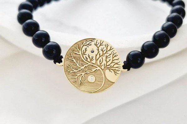 Bratara Arborele Vietii cu Yin&Yang – Argint 925 Placat cu Aur 18K, Onix Negru si Diamante Naturale