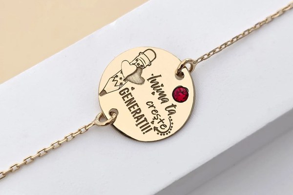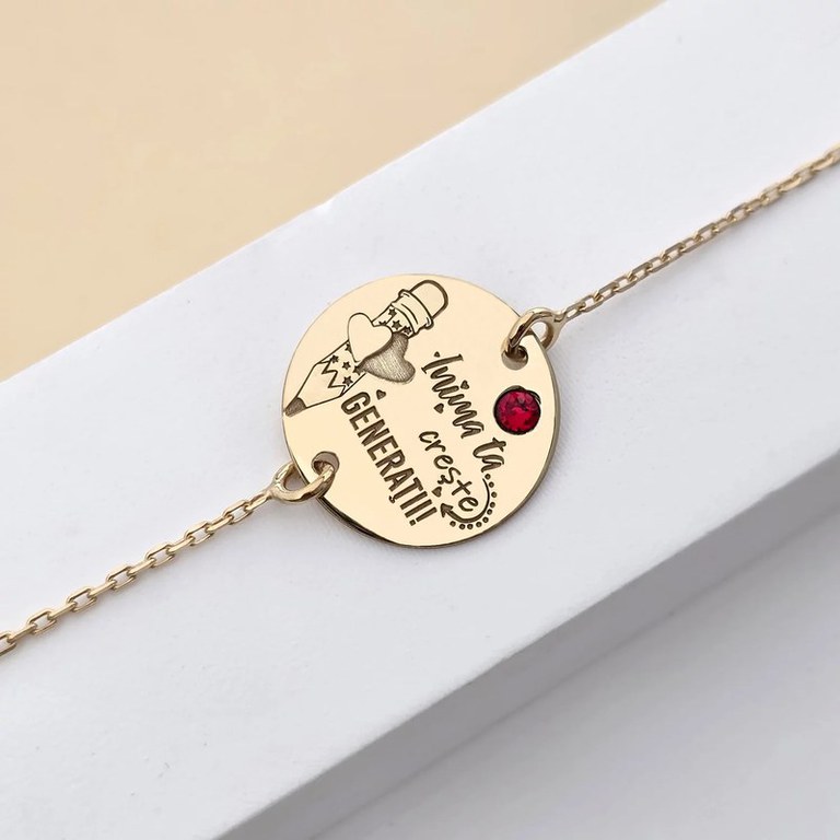 Bratara banut 15 mm - Inima ta creste generatii - Argint 925 placat cu Aur Galben 18K si Cristal Swarovski Această brățară elegantă cu bănuț de 15 mm este un gest sincer de apreciere pentru educatoarea care modelează cu grijă și iubire generații întregi. Realizată din Argint 925 placat cu Aur Galben 18K, este accesorizată cu un Cristal Swarovski ce adaugă un strop de strălucire. Mesajul „Inima ta crește generații” reflectă impactul profund al unei inimi devotate educației. Dăruiește-i educatoarei un simbol al recunoștinței – comandă acum și spune „mulțumesc” într-un mod special! Caracteristici produs: Material: Argint 925 placat cu Aur Galben 18K Dimensiuni:  15 mm Decorare:  Decorat cu un mesaj personalizat. Greutate: Aproximativ 1.81 grame Procesul de productie Chic Bijoux: Aceasta bijuterie personalizata este realizata de la zero pentru fiecare comanda in parte. Dupa plasarea si confirmarea comenzii, incepe procesul ei de creatie: Realizare Design -> Taiere/Personalizare -> Finisare manuala -> Polish Final -> Ambalare -> Livrare! Datorita procesului de productie si a personalizarii bijuteriei dupa propria dorinta,  gramajul final al produsului poate varia . Pe site este afisat gramajul obtinut prin cantarirea produsului din pozele de prezentare. Pretul include, pe langa costul gramului de  Argint 925 , intregul proces de productie si personalizare, garantand un produs unic si special, creat doar pentru tine. De ce sa alegi Chic Bijoux? Fiecare bijuterie Chic Bijoux este realizata cu pasiune, respectand cele mai inalte standarde de calitate: Bijuterii unice realizate manual, personalizate pentru fiecare client. Ambalaj premium, perfect pentru a fi oferit cadou. Garantia calitatii:  din 2010 producem bijuterii din metale pretioase de cea mai bună calitate folosind tehnologie de ultimă generație și finisare manuală. Dupa plasarea comenzii, vei fi contactat de un reprezentant al echipei Chic Bijoux pentru toate detaliile necesare personalizarii produsului si a ne asigura ca produsul final corespunde asteptarilor tale. Toate produsele din Argint 925 comercializate de Chic Bijoux sunt marcate cu titlul Argintului · 925.