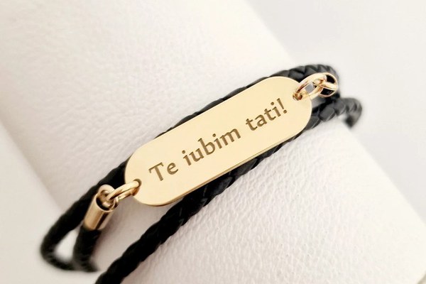 Arata-i unui prieten, sotului sau tatalui tau cat de mult inseamna pentru tine printr-o bratara special creata pentru el care sa ii reflecte personalitatea. O bijuterie deosebita potrivita pentru un barbat. Gramaj aproximativ ARGINT 925: 2.95 grame Aceasta bijuterie personalizata este realizata de la zero pentru fiecare comanda in parte. Dupa plasarea si confirmarea comenzii incepe procesul ei de creatie: Realizare Design -> Taiere/Personalizare -> Finisare manuala -> Polish Final -> Ambalare -> Livrare! Datorita procesului de productie si a personalizarii bijuteriei dupa propria dorinta gramajul final al produsului poate fi diferit. Din acest motiv pe site este afisat gramajul obtinut prin catarirea produsului realizat in pozele de prezentare. Pretul produsului include pe langa costul gramului de Argint 925 placat cu Aur Galben 18K si tot procesul de mai sus, necesar pentru realizarea unui produs cu adevarat special pentru tine. Toate produsele din Argint 925 comercializate de Chic Bijoux sunt marcate cu titlul Argintului· 925 · DESPRE PRODUS: Bratara este creata pe marimi, prin urmare te rugam sa ne spui in casuta 'Marime bratara' care este circumferinta incheieturii in cm. Placuta este creata din Argint 925 placat cu Aur Galben 18K si are dimensiunea de 10x30 mm. Textul gravat poate fi cel din imagine sau unul ales de tine. In plus, poti alege o gravura speciala si pe verso. Bratara este creata din 3 straturi de piele impletita. Sistemul de inchidere a bratarii este cu inchizatoare clips din otel inoxidabil. Daca nu stii care e marimea ta sau a persoanei careia doresti sa ii faci cadou bratara, articolul ' Cum sa masori dimensiunea incheieturii? ' de pe blogul Chic Bijoux iti vine in ajutor. RECOMANDARI: Nu scufundati bratara in lichide sau substante de curatare: pielea se poate decolora sau decoji, iar bijuteriile placate se deterioriaza si isi pot chiar schimba culoarea. Contactul zilnic cu apa (bai) sau cu produse chimice (spray-uri, detergenti, inalbitor, clor, diluanti etc.) pot de asemena sa afecteze bijuteria, existand riscul de a se desface si/sau de a se decolora. Pentru ca bratara sa vi se potriveasca te rugam sa ne transmiti marimea. Dupa plasarea comenzii veti fi contactat de o colega din echipa Chic Bijoux pentru toate detaliile necesare personalizarii produsului. Bijuteria va ajunge la tine intr-un saculet elegant din catifea, impreuna cu certificatul de calitate ce atesta autenticitatea materialelor folosite