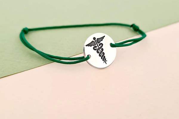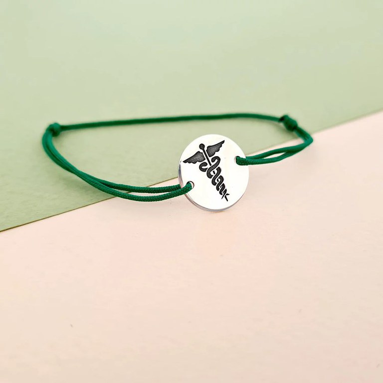 Caduceus - simbolul medicinei - reprezentat prin doi serpi incolaciti in jurul unui baston inaripat. Caduceul, in Antichitate, reprezenta planeta Mercur, iar in iconografia romana se gasea in mana stanga a zeului Hermes (zeul roman Mercur). In secolul XIX, un editor medical foloseste simbolul pe textele sale (pentru ca Hermes era zeul mesagerilor si de aici, al transmiterii informatiilor) si astfel incepe asocierea dintre caduceu si medicina, asociere intarita de utilizarea semnului de catre corpul armatei americane in timpul primului razboi mondial. Un simbol, initial reprezentativ pentru intelepciune, elocventa si comunicare, devine astfel un logo pentru domeniul medical. Bratara poate fi un cadou personalizat pentru medici, doctori, rezidenti, studenti etc. De asemenea poti alege sa gravezi o data, o mica amintire sau initiala pe banutul din Argint 925 de 1,5 cm. Gramaj aproximativ ARGINT 925: 0.9 grame Aceasta bijuterie personalizata este realizata de la zero pentru fiecare comanda in parte. Dupa plasarea si confirmarea comenzii incepe procesul ei de creatie: Realizare Design -> Taiere/Personalizare -> Finisare manuala -> Polish Final -> Ambalare -> Livrare! Datorita procesului de productie si a personalizarii bijuteriei dupa propria dorinta gramajul final al produsului poate fi diferit. Din acest motiv pe site este afisat gramajul obtinut prin catarirea produsului realizat in pozele de prezentare. Pretul produsului include pe langa costul gramului de Argint 925 si tot procesul de mai sus, necesar pentru realizarea unui produs cu adevarat special pentru tine. Toate produsele din Argint 925 comercializate de Chic Bijoux sunt marcate cu titlul Argintului· 925 · Dupa plasarea comenzii veti fi contactat de o colega din echipa Chic Bijoux pentru toate detaliile necesare personalizarii produsului.