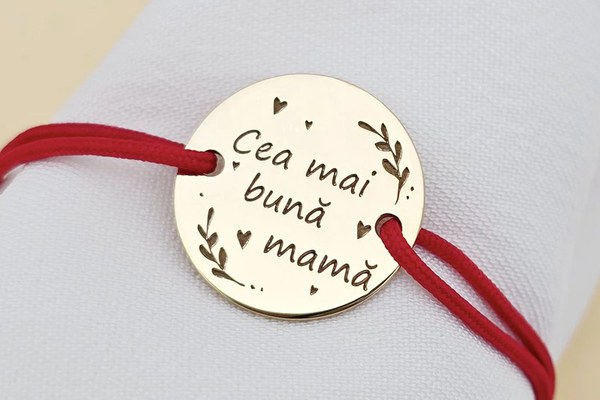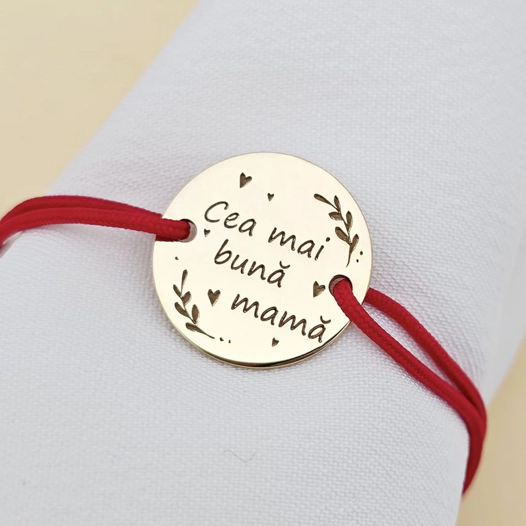 Acorda-i mamei tale titlul de 'Cea mai buna mama' si arata-ti recunostinta pentru munca depusa de ea in crestrea omului care esti azi, pentru daruire, pentru dragoste si pentru perseverenta. Un cadou deosebit pentru cea mai buna, cea mai iubita, cea mai frumoasa - mama mea! Gramaj aproximativ ARGINT 925:0.9 grame Aceasta bijuterie personalizata este realizata de la zero pentru fiecare comanda in parte. Dupa plasarea si confirmarea comenzii incepe procesul ei de creatie: Realizare Design -> Taiere/Personalizare -> Finisare manuala -> Polish Final -> Ambalare -> Livrare! Datorita procesului de productie si a personalizarii bijuteriei dupa propria dorinta gramajul final al produsului poate fi diferit. Din acest motiv pe site este afisat gramajul obtinut prin catarirea produsului realizat in pozele de prezentare. Pretul produsului include pe langa costul gramului de Argint 925 placat cu Aur Galben 18K si tot procesul de mai sus, necesar pentru realizarea unui produs cu adevarat special pentru tine. Toate produsele din Argint 925 comercializate de Chic Bijoux sunt marcate cu titlul Argintului· 925 · DESPRE PRODUS: Banutul este creat din Argint 925 placat cu Aur Galben 18K. Dimensiunea banutului este de 15 mm. Gravarea unui nume, a unei date sau a unui mesaj scurt pe spate este gratuita. Bratara este creata dintr-un snur din matase vegetala, marime reglabila, potrivit pe orice incheietura. Bijuteria va ajunge la tine intr-un saculet elegant Chic Bjoux gata de a fi daruita, impreuna cu certificatul de garantie, care atesta autenticitatea si caracteristicile metalului pretios. Dupa plasarea comenzii veti fi contactat de o colega din echipa Chic Bijoux pentru toate detaliile necesare personalizarii