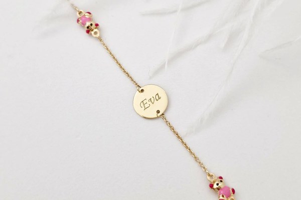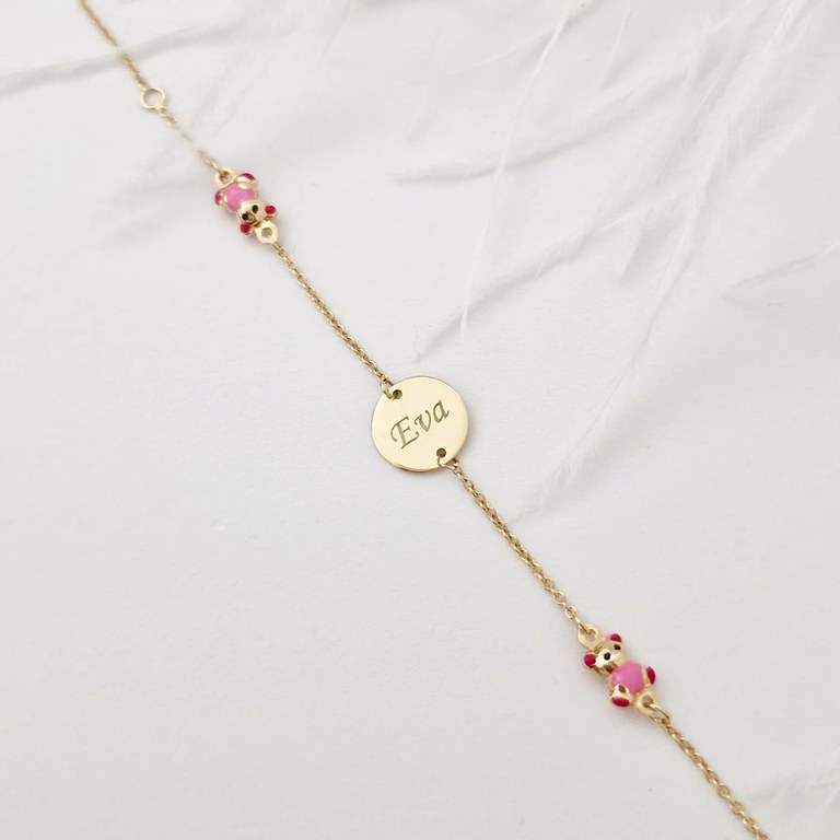 Bratara Chic Baby - Banut personalizat si Ursuleti cu email roz - Lantisor ajustabil - Aur Galben 9K