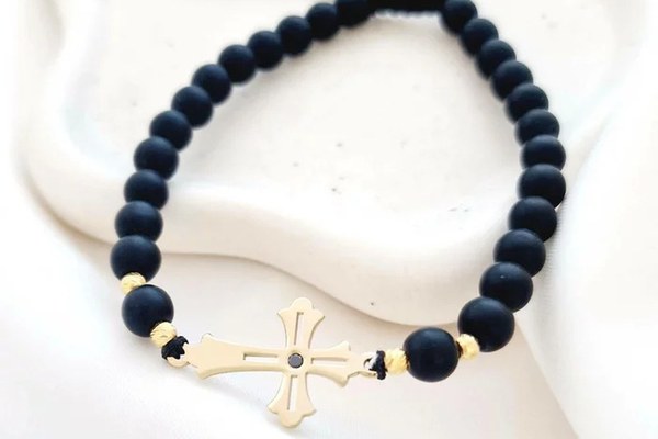 Bratara cu pietre Onix - Model Cruce cu Diamant Negru si Bilute - Argint 925 placat cu Aur galben 18K- Snur reglabil