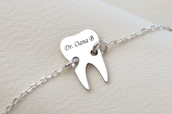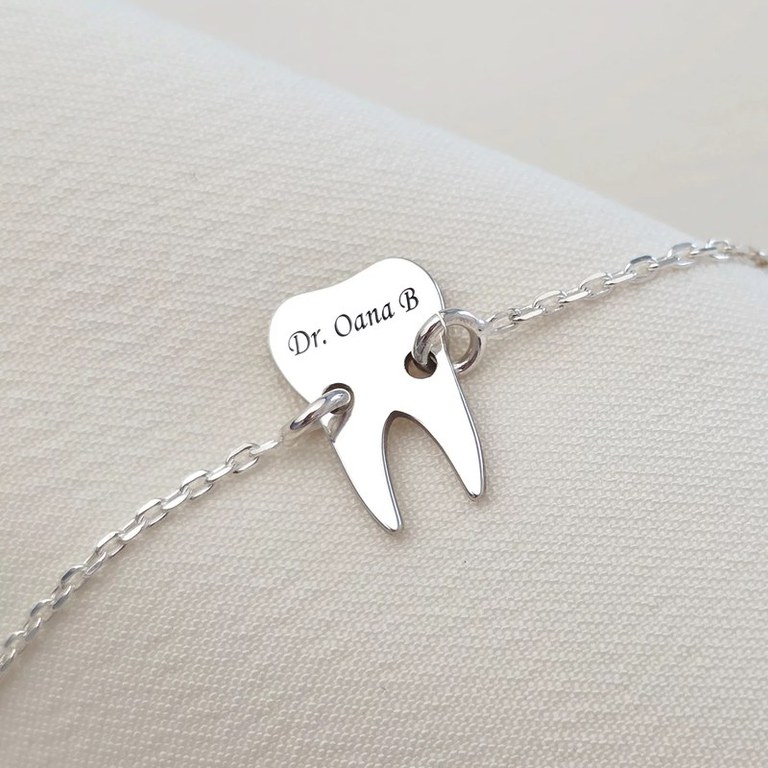 S e zice ca un mar pe zi tine dentistul la distanta, dar noi va recomandam sa il tineti aproape de voi cu un cadou simpatic si de efect: o bratara dinte pe care puteti alege sa o personalizati prin gravarea numelui sau initialelor. Bratara este creata din Argint 925 prin taiere si gravare laser, avand dimensiunea de 12 x 8 mm si vine atasata de un lantisor din Argint 925. Dimensiunea totala a bratarii este de 15,8 cm, iar la cerere se poate adauga o prelungire de 5 cm. Un cadou deosebit! Gramaj aproximativ ARGINT 925: 1.26 grame Aceasta bijuterie personalizata este realizata de la zero pentru fiecare comanda in parte. Dupa plasarea si confirmarea comenzii incepe procesul ei de creatie: Realizare Design -> Taiere/Personalizare -> Finisare manuala -> Polish Final -> Ambalare -> Livrare! Datorita procesului de productie si a personalizarii bijuteriei dupa propria dorinta gramajul final al produsului poate fi diferit. Din acest motiv pe site este afisat gramajul obtinut prin catarirea produsului realizat in pozele de prezentare. Pretul produsului include pe langa costul gramului de Argint 925 si tot procesul de mai sus, necesar pentru realizarea unui produs cu adevarat special pentru tine. Toate produsele din Argint 925 comercializate de Chic Bijoux sunt marcate cu titlul Argintului· 925 · Dupa plasarea comenzii vei fi contactat de o colega din echipa Chic Bijoux pentru toate detaliile necesare personalizarii produsului.