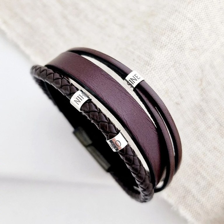 Bratara Gentleman - Model barbatesc cu piele maro - Cilindri cu gravura personalizata din Argint 925 - Inchizatoare neagra inox
