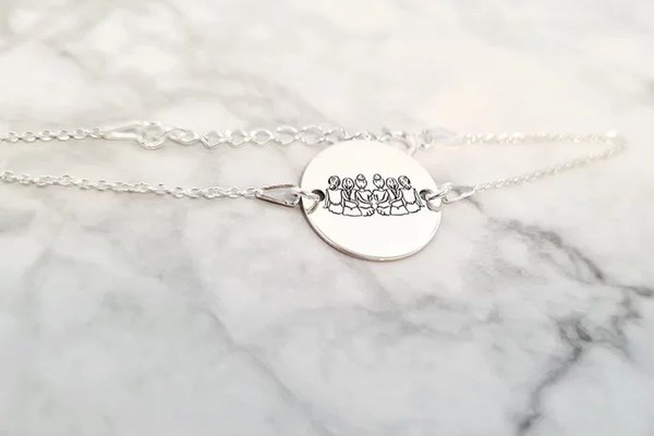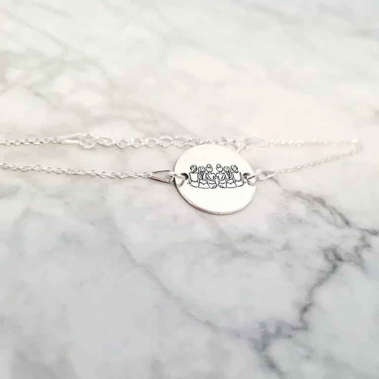 Prietenele sunt partenerele tale la bine si la rau. Cu ele langa tine, simti ca poti cucerii lumea. Sarbatoreste legatura speciala dintre tine si surorile de suflet cu bratara personalizata cu 6 siluete. Pe verso poti alege sa fie gravat un mesaj personal, numele voastre precum si o data specifica. Scrie-ne in casuta la Personalizare spate ceea ce iti doresti. DESPRE PRODUS: Pandantul este creat din Argint 925. Diametrul banutului este de 18 mm. Acesta este atasat de un lantisor din Argint 925 de 15 cm cu o prelungire de 5 cm. Inchizatoarea este de tip carabina. Poti alege sa sa personalizezi bratara pe verso cu propriul mesaj, cu nume sau cu o data semnificativa. Completeaza casutele de personalizare cu ceea ce iti doresti. Bijuteria va ajunge la tine intr-un saculet elegant din catifea, impreuna cu certificatul de calitate ce atesta autenticitatea materialelor folosite. Gramaj aproximativ ARGINT 925:2.3 grame Aceasta bijuterie personalizata este realizata de la zero pentru fiecare comanda in parte. Dupa plasarea si confirmarea comenzii incepe procesul ei de creatie: Realizare Design -> Taiere/Personalizare -> Finisare manuala -> Polish Final -> Ambalare -> Livrare! Datorita procesului de productie si a personalizarii bijuteriei dupa propria dorinta gramajul final al produsului poate fi diferit. Din acest motiv pe site este afisat gramajul obtinut prin catarirea produsului realizat in pozele de prezentare. Pretul produsului include pe langa costul gramului de Argint 925 si tot procesul de mai sus, necesar pentru realizarea unui produs cu adevarat special pentru tine. Toate produsele din Argint 925 comercializate de Chic Bijoux sunt marcate cu titlul Argintului· 925 · Dupa plasarea comenzii veti fi contactat de o colega din echipa Chic Bijoux pentru toate detaliile necesare personalizarii produsului.