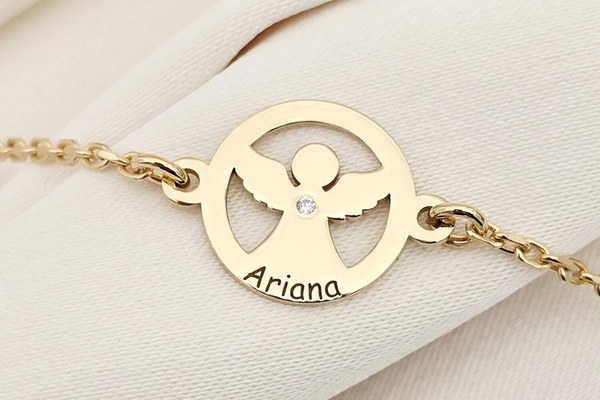 Brățară personalizată cu disc si înger decupat, nume personalizat și Diamant natural – Argint 925 placat cu Aur Galben 18K - Cu lantisor fata/baiat
