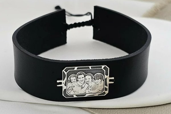 Bratara personalizata cu poza - Octagon cu emoții - Model fotogravura relief - Argint 925 - Piele barbateasca