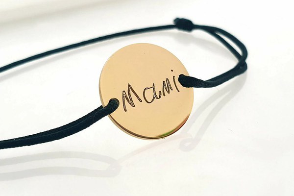 Ce ar putea fi mai personal si unic decat scrisul copilului tau sau a unei persoane dragi gravat pe o bijuterie pentru totdeauna? Prima data cand copilul tau a scris cu manuta lui “Mama” sau primul biletel cu “Te iubesc” din partea jumatatii tale, dar si alte cuvinte semnificative pot fi gravate pe bratara pe care sa o porti in fiecare zi. CUM PROCEDEZI PENTRU COMANDA: Pentru a putea transforma scrisul de mana intr-o gravura unica incarca o imaginea cat mai clara a scrisului direct in comanda sau poti sa o trimiti pe mail: comenzi @ chicbijoux.ro Pentru o preluare cat mai calitativa a scrisului acesta trebuie sa fie realizat pe o coala de hartie alba si sa fie cu o culoare inchisa si vizibila. De asemenea, poza trimisa sa aiba o luminozitate cat mai mare. Avand in vedere dimensiunea banutului pe acesta vor incapea maxim 3-5 cuvinte gravate pe mai multe randuri. In cazul in care iti doresti un text mai mare contacteaza-ne pentru a te ajuta sa gasesti cea mai buna varianta. Gramaj aproximativ ARGINT 925: 0.98 grame Aceasta bijuterie personalizata este realizata de la zero pentru fiecare comanda in parte. Dupa plasarea si confirmarea comenzii incepe procesul ei de creatie: Realizare Design -> Taiere/Personalizare -> Finisare manuala -> Polish Final -> Ambalare -> Livrare! Datorita procesului de productie si a personalizarii bijuteriei dupa propria dorinta gramajul final al produsului poate fi diferit. Din acest motiv pe site este afisat gramajul obtinut prin catarirea produsului realizat in pozele de prezentare. Pretul produsului include pe langa costul gramului de Argint 925 si tot procesul de mai sus, necesar pentru realizarea unui produs cu adevarat special pentru tine. Toate produsele din Argint 925 comercializate de Chic Bijoux sunt marcate cu titlul Argintului· 925 · DESPRE PRODUS: Pandantul este creat din Argint 925. Acesta este placat cu Aur Galben de 18K. Dimensiunea lui este de 15 mm. Bratara este creata dintr-un snur din matase vegetala, marime reglabila, potrivit pe orice incheietura. Gravarea unui nume, a unei date sau a unui mesaj scurt pe verso este gratuita. Gravura scrisului de mana poate fi personalizata si pe alte modele de bratari, pe pandantive simple, pandantive cu lantisoare sau breloc. Scrie-ne pentru mai multe detalii. Dupa plasarea comenzii veti fi contactat de o colega din echipa Chic Bijoux pentru toate detaliile necesare personalizarii produsului.