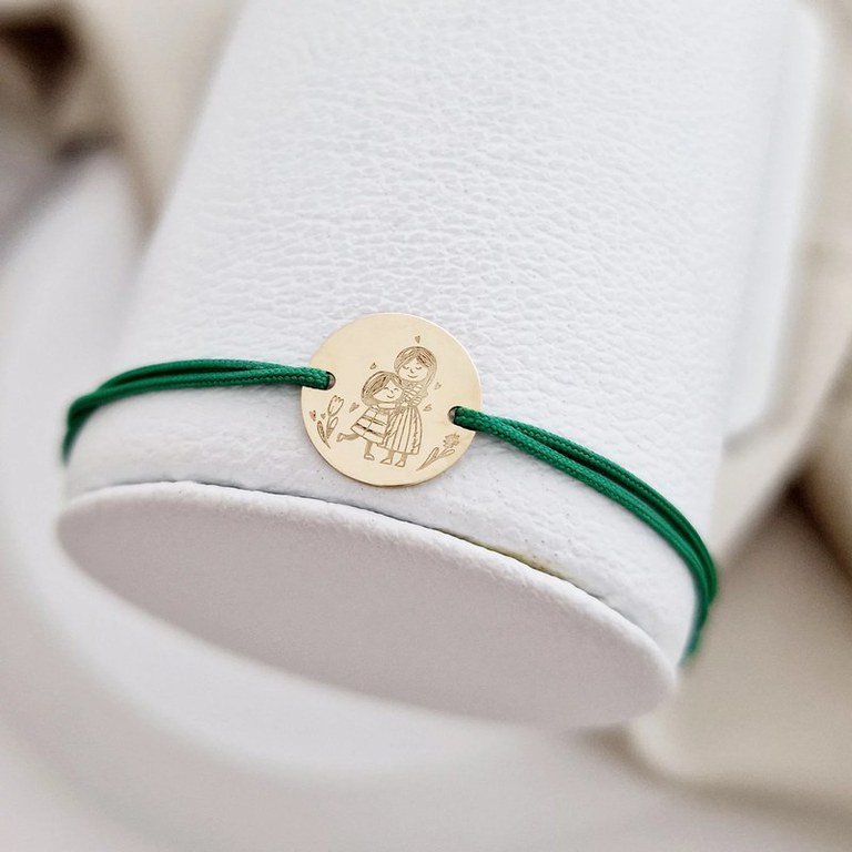 Bratara personalizata - Mama si fiica - Imbratisare - Banut de 12 mm - Aur Galben 14K - snur reglabil