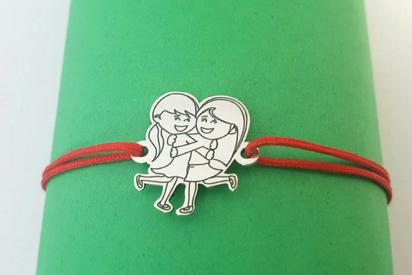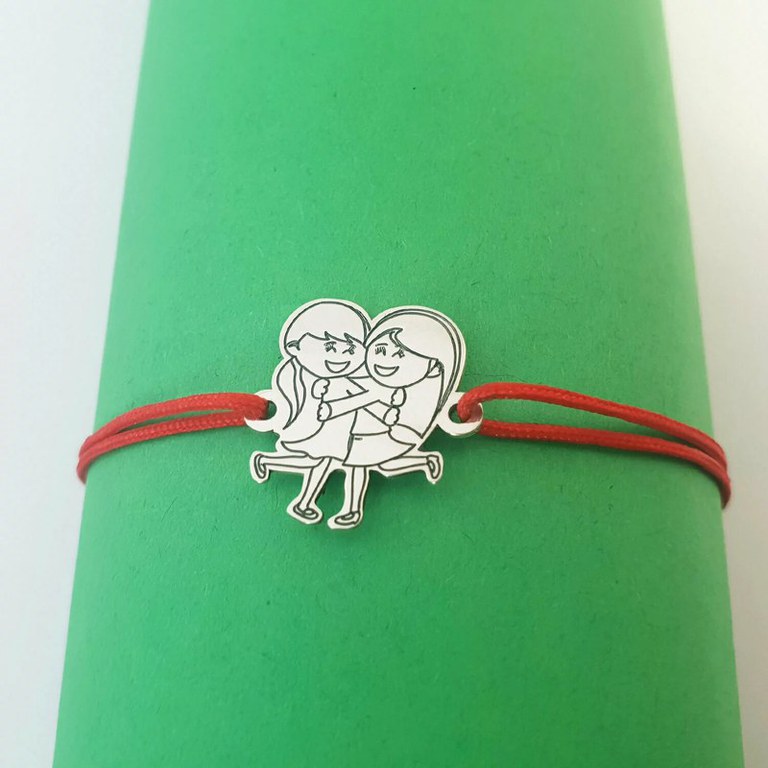 Bratara personalizata - Model decupat - 2 fete/surori/prietene imbratisate - Argint 925 - snur reglabil