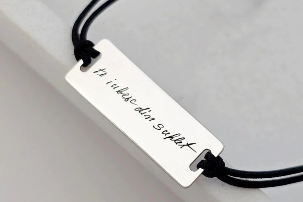 Ce ar putea fi mai personal si unic decat scrisul copilului tau sau a unei persoane dragi gravat pe o bijuterie pentru totdeuna? Dar un semnatura proprie, a cuiva drag tie sau chiar a unei vedete pe care o admiri? Acum toate acestea pot fi inscriptionate pe bijuterii pe care sa le porti mereu. CUM PROCEDEZI PENTRU COMANDA: Pentru a putea transforma semnatura sau scrisul de mana intr-o gravura unica incarca o imaginea cat mai clara direct in comanda sau poti sa o trimiti pe mail: comenzi @ chicbijoux.ro Pentru o preluare cat mai calitativa a scrisului/desenului acesta trebuie sa fie realizat pe o coala de hartie alba si sa fie cu o culoare inchisa si vizibila. De asemenea, poza trimisa sa aiba o luminiozitate cat mai mare. Avand in vedere dimensiunea placutei pe acesta vor incapea maxim 3-5 cuvinte gravate. In cazul in care iti doresti un text mai mare contacteaza-ne pentru a te ajuta sa gasesti cea mai buna varianta. DESPRE PRODUS: Placuta este creata din Argint 925. Dimensiunea ei este de 9 x 25 mm. Bratara este creata dintr-un snur negru gros, marime reglabila, potrivit pe orice incheietura. Gravarea unui nume, a unei date sau a unui mesaj scurt pe verso este gratuita. Gramaj aproximativ ARGINT 925: 1.51 grame Aceasta bijuterie personalizata este realizata de la zero pentru fiecare comanda in parte. Dupa plasarea si confirmarea comenzii incepe procesul ei de creatie: Realizare Design -> Taiere/Personalizare -> Finisare manuala -> Polish Final -> Ambalare -> Livrare! Datorita procesului de productie si a personalizarii bijuteriei dupa propria dorinta gramajul final al produsului poate fi diferit. Din acest motiv pe site este afisat gramajul obtinut prin catarirea produsului realizat in pozele de prezentare. Pretul produsului include pe langa costul gramului de Argint 925 si tot procesul de mai sus, necesar pentru realizarea unui produs cu adevarat special pentru tine. Toate produsele din Argint 925 comercializate de Chic Bijoux sunt marcate cu titlul Argintului· 925 · Gravura scrisului de mana poate fi personalizata si pe alte modele de bratari, pe pandantive simple, pandantive cu lantisoare sau breloc. Scrie-ne pentru mai multe detalii. Dupa plasarea comenzii veti fi contactat de o colega din echipa Chic Bijoux pentru toate detaliile necesare personalizarii produsului.