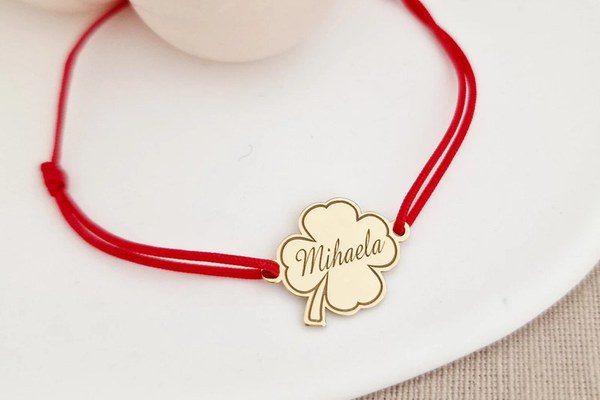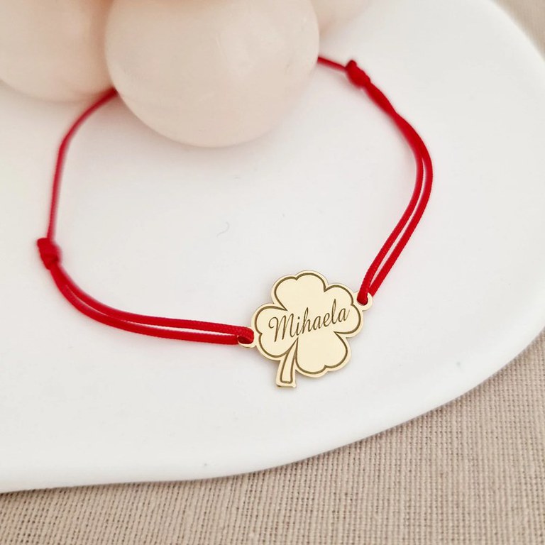 Bratara personalizata - Trifoi cu nume - Argint 925 placat cu Aur Galben 18K- Snur reglabil, diverse culori
