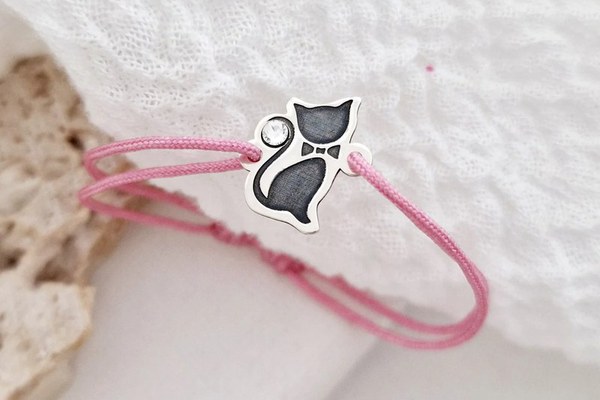 Bratara Pisica cu papion - Argint 925 - cristal Swarovski - snur reglabil