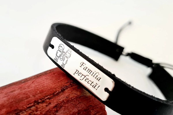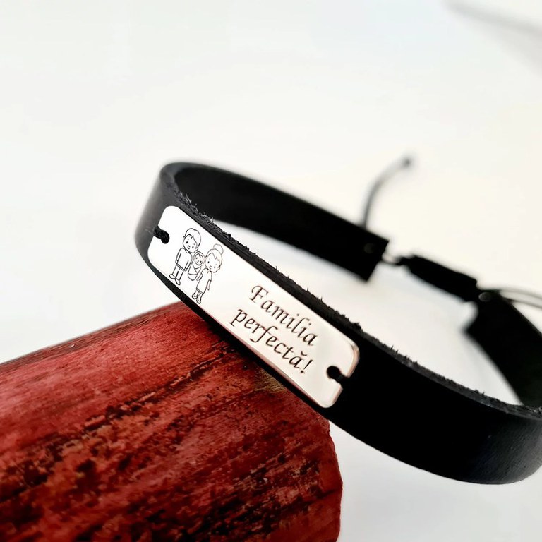 Un barbat obisnuit se poate indragosti, dar unul grozav poate deveni un sot devotat. Un barbat obisnuit poate fi tata, dar unul grozav va fi un tatic iubit. Arata-i sotului si/sau tatalui tau cat de mult inseamna pentru tine printr-o bratara special creata pentru el. Placuta bratarii poate fi personalizata cu membri familiei tale. Scrie un comentariu cu ceea ce iti doresti si noi vom crea pentru tine bratara perfecta! DESPRE PRODUS: Placuta gravata este din Argint 925 si vine atasata pe o bratara din piele neagra sau maro. Pe acesta puteti alege sa gravati un mesaj special. Bratara este reglabila prin intermediul unui snur din matase vegetala prins la capetele bandei de piele. Dimensiunea minima standard este de 20 cm, insa aceasta poate fi modificata la cerere -> Spune-ne in casuta Marime bratara care este circumferinta incheieturii. Bratara din piele are latimea de 10 mm. Poti alege intre culoarea neagra sau maro. Spune-ne in casuta de comentarii ce culoare doresti. Gramaj aproximativ ARGINT 925: 1.21 grame Aceasta bijuterie personalizata este realizata de la zero pentru fiecare comanda in parte. Dupa plasarea si confirmarea comenzii incepe procesul ei de creatie: Realizare Design -> Taiere/Personalizare -> Finisare manuala -> Polish Final -> Ambalare -> Livrare! Datorita procesului de productie si a personalizarii bijuteriei dupa propria dorinta gramajul final al produsului poate fi diferit. Din acest motiv pe site este afisat gramajul obtinut prin catarirea produsului realizat in pozele de prezentare. Pretul produsului include pe langa costul gramului de Argint 925 si tot procesul de mai sus, necesar pentru realizarea unui produs cu adevarat special pentru tine. Toate produsele din Argint 925 comercializate de Chic Bijoux sunt marcate cu titlul Argintului· 925 · RECOMANDARI: Pentru ca bratara sa vi se potriveasca te rugam sa ne transmiti marimea in casuta. Nu scufundati bratara in lichide sau substante de curatare: pielea se poate decolora sau decoji, iar bijuteriile placate se deterioriaza si isi pot chiar schimba culoarea. Contactul zilnic cu apa (bai) sau cu produse chimice (spray-uri, detergenti, inalbitor, clor, diluanti etc.) pot de asemena sa afecteze bijuteria, existand riscul de a se desface si/sau de a se decolora. Dupa plasarea comenzii va va contacta o colega din echipa Chic Bijoux pentru toate detaliile necesare personalizarii produsului.