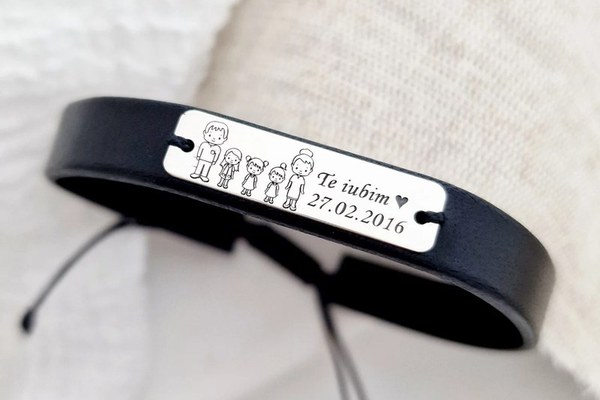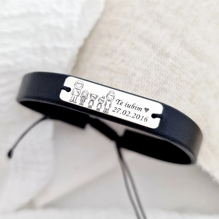 Un barbat obisnuit se poate indragosti, dar unul grozav poate deveni un sot devotat. Un barbat obisnuit poate fi tata, dar unul grozav va fi un tatic iubit. Arata-i sotului si/sau tatalui tau cat de mult inseamna pentru tine printr-o bratara special creata pentru el. Placuta bratarii poate fi personalizata cu membri familiei tale. Scrie un comentariu cu ceea ce iti doresti si noi vom crea pentru tine bratara perfecta! DESPRE PRODUS: Placuta gravata este din Argint 925 si vine atasata pe o bratara din piele neagra sau maro. Pe acesta puteti alege sa gravati un mesaj special. Bratara este reglabila prin intermediul unui snur din matase vegetala prins la capetele bandei de piele. Dimensiunea minima standard este de 20 cm, insa aceasta poate fi modificata la cerere -> Spune-ne in casuta Marime bratara care este circumferinta incheieturii. Bratara din piele are latimea de 10 mm. Poti alege intre culoarea neagra sau maro. Spune-ne in casuta de comentarii ce culoare doresti. Gramaj aproximativ ARGINT 925:1.21 grame Aceasta bijuterie personalizata este realizata de la zero pentru fiecare comanda in parte. Dupa plasarea si confirmarea comenzii incepe procesul ei de creatie: Realizare Design -> Taiere/Personalizare -> Finisare manuala -> Polish Final -> Ambalare -> Livrare! Datorita procesului de productie si a personalizarii bijuteriei dupa propria dorinta gramajul final al produsului poate fi diferit. Din acest motiv pe site este afisat gramajul obtinut prin catarirea produsului realizat in pozele de prezentare. Pretul produsului include pe langa costul gramului de Argint 925 si tot procesul de mai sus, necesar pentru realizarea unui produs cu adevarat special pentru tine. Toate produsele din Argint 925 comercializate de Chic Bijoux sunt marcate cu titlul Argintului· 925 · RECOMANDARI: Pentru ca bratara sa vi se potriveasca te rugam sa ne transmiti marimea in casuta. Nu scufundati bratara in lichide sau substante de curatare: pielea se poate decolora sau decoji, iar bijuteriile placate se deterioriaza si isi pot chiar schimba culoarea. Contactul zilnic cu apa (bai) sau cu produse chimice (spray-uri, detergenti, inalbitor, clor, diluanti etc.) pot de asemena sa afecteze bijuteria, existand riscul de a se desface si/sau de a se decolora. Dupa plasarea comenzii va va contacta o colega din echipa Chic Bijoux pentru toate detaliile necesare personalizarii produsului.