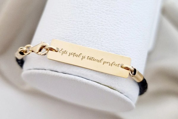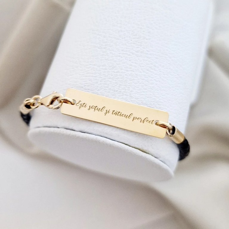Un barbat obisnuit se poate indragosti, dar unul grozav poate deveni un sot devotat. Un barbat obisnuit poate fi tata, dar unul grozav va fi un tatic iubit. Arata-i sotului si/sau tatalui tau cat de mult inseamna pentru tine printr-o bratara special creata pentru el. DESPRE PRODUS: Placuta gravata este din Argint 925 placat cu Aur 14k Pe ea puteti alege sa gravati un mesaj special. Acesta vine prinsa de o bratara din piele impletita neagra. Sistemul de inchidere a bratarii este cu inchizatoare tip carabina. Daca nu stii care e marimea ta sau a persoanei careia doresti sa ii faci cadou bratara, articolul Cum sa masori dimensiunea incheieturii? de pe blogul Chic Bijoux iti vine in ajutor. Gramaj aproximativ ARGINT 925: 2 grame Aceasta bijuterie personalizata este realizata de la zero pentru fiecare comanda in parte. Dupa plasarea si confirmarea comenzii incepe procesul ei de creatie: Realizare Design -> Taiere/Personalizare -> Finisare manuala -> Polish Final -> Ambalare -> Livrare! Datorita procesului de productie si a personalizarii bijuteriei dupa propria dorinta gramajul final al produsului poate fi diferit. Din acest motiv pe site este afisat gramajul obtinut prin catarirea produsului realizat in pozele de prezentare. Pretul produsului include pe langa costul gramului de Argint 925 si tot procesul de mai sus, necesar pentru realizarea unui produs cu adevarat special pentru tine. Toate produsele din Argint 925 comercializate de Chic Bijoux sunt marcate cu titlul Argintului· 925 · RECOMANDARI: Nu scufundati bratara in lichide sau substante de curatare: pielea se poate decolora sau decoji, iar bijuteriile placate se deterioriaza si isi pot chiar schimba culoarea. Contactul zilnic cu apa (bai) sau cu produse chimice (spray-uri, detergenti, inalbitor, clor, diluanti etc.) pot de asemena sa afecteze bijuteria, existand riscul de a se desface si/sau de a se decolora. Pentru ca bratara sa vi se potriveasca te rugam sa ne transmiti marimea. Dupa plasarea comenzii va va contacta o colega din echipa Chic Bijoux pentru toate detaliile necesare personalizarii produsului.