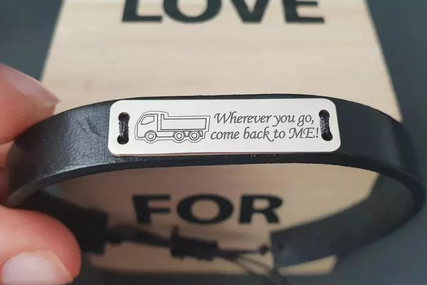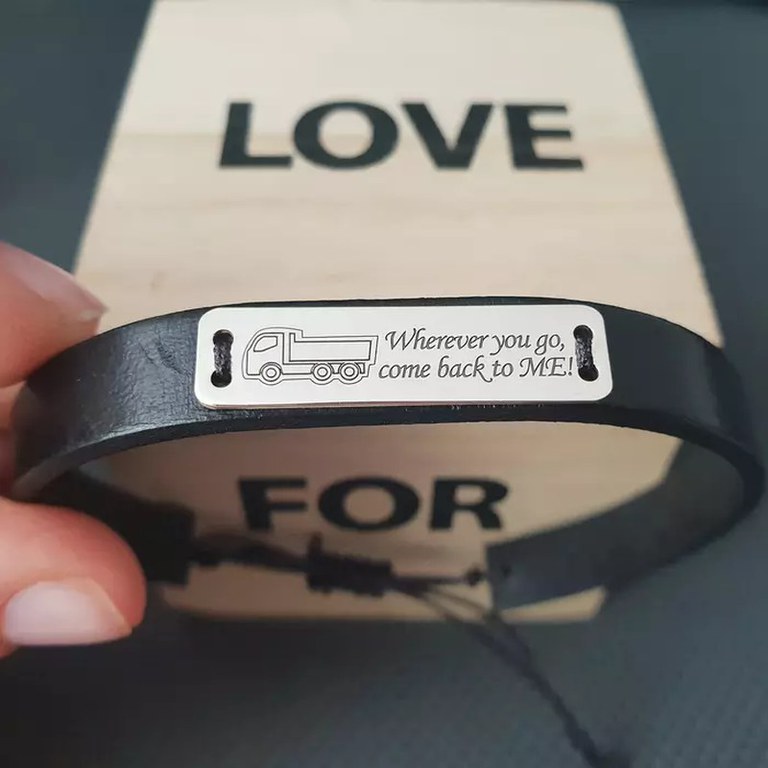 Bratara Placuta gravata cu un Camion si Text - Argint 925, piele