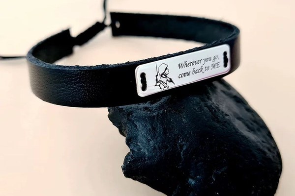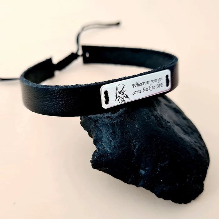 >> Wherever you go, come back to me! < < Placuta este creata din Argint 925 prin taiere si gravare laser si este prinsa de o bratara din piele. Daca iti doresti un alt mesaj scrie-ne un comentariu, iar noi vom crea pentru tine bratara perfecta! Dupa plasarea comenzii veti fi contactat de o colega din echipa Chic Bijoux pentru toate detaliile necesare personalizarii produsului. DESPRE PRODUS: Placuta gravata este din Argint 925 si vine atasata pe o bratara din piele neagra sau maro. Pe acesta puteti alege sa gravati un mesaj special. Bratara este reglabila prin intermediul unui snur din matase vegetala prins la capetele bandei de piele. Dimensiunea minima standard este de 20 cm, insa aceasta poate fi modificata la cerere -> Spune-ne in casuta Marime bratara care este circumferinta incheieturii. Bratara din piele are latimea de 10 mm. Poti alege intre culoarea neagra sau maro. Spune-ne in casuta de comentarii ce culoare doresti. Gramaj aproximativ ARGINT 925:1.21 grame Aceasta bijuterie personalizata este realizata de la zero pentru fiecare comanda in parte. Dupa plasarea si confirmarea comenzii incepe procesul ei de creatie: Realizare Design -> Taiere/Personalizare -> Finisare manuala -> Polish Final -> Ambalare -> Livrare! Datorita procesului de productie si a personalizarii bijuteriei dupa propria dorinta gramajul final al produsului poate fi diferit. Din acest motiv pe site este afisat gramajul obtinut prin catarirea produsului realizat in pozele de prezentare. Pretul produsului include pe langa costul gramului de Argint 925 si tot procesul de mai sus, necesar pentru realizarea unui produs cu adevarat special pentru tine. Toate produsele din Argint 925 comercializate de Chic Bijoux sunt marcate cu titlul Argintului· 925 · RECOMANDARI: Pentru ca bratara sa vi se potriveasca te rugam sa ne transmiti marimea in casuta. Nu scufundati bratara in lichide sau substante de curatare: pielea se poate decolora sau decoji, iar bijuteriile placate se deterioriaza si isi pot chiar schimba culoarea. Contactul zilnic cu apa (bai) sau cu produse chimice (spray-uri, detergenti, inalbitor, clor, diluanti etc.) pot de asemena sa afecteze bijuteria, existand riscul de a se desface si/sau de a se decolora.