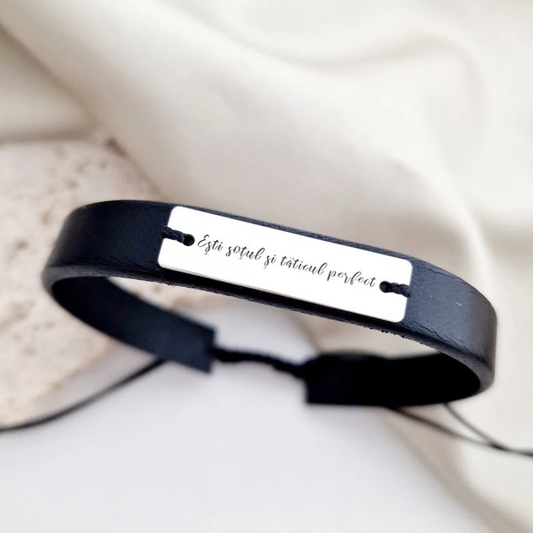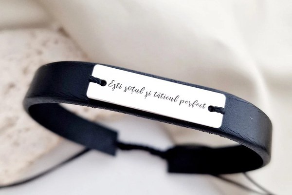 Un barbat obisnuit se poate indragosti, dar unul grozav poate deveni un sot devotat. Un barbat obisnuit poate fi tata, dar unul grozav va fi un tatic iubit. Arata-i sotului si/sau tatalui tau cat de mult inseamna pentru tine printr-o bratara special creata pentru el. DESPRE PRODUS: Placuta gravata este din Argint 925 si vine atasata pe o bratara din piele neagra sau maro. Pe acesta puteti alege sa gravati un mesaj special. Bratara este reglabila prin intermediul unui snur din matase vegetala, prins la capetele bandei de piele. Dimensiunea minima standard este de 20 cm, insa aceasta poate fi modificata la cerere -> Spune-ne in casuta Marime bratara care este circumferinta incheieturii. Bratara din piele are latimea de 10 mm. Poti alege intre culoarea neagra sau maro. Spune-ne in casuta de comentarii ce culoare doresti. Gramaj aproximativ ARGINT 925: 1.21 grame Aceasta bijuterie personalizata este realizata de la zero pentru fiecare comanda in parte. Dupa plasarea si confirmarea comenzii incepe procesul ei de creatie: Realizare Design -> Taiere/Personalizare -> Finisare manuala -> Polish Final -> Ambalare -> Livrare! Datorita procesului de productie si a personalizarii bijuteriei dupa propria dorinta gramajul final al produsului poate fi diferit. Din acest motiv pe site este afisat gramajul obtinut prin cantarirea produsului realizat in pozele de prezentare. Pretul produsului include pe langa costul gramului de Argint 925 si tot procesul de mai sus, necesar pentru realizarea unui produs cu adevarat special pentru tine. Toate produsele din Argint 925 comercializate de Chic Bijoux sunt marcate cu titlul Argintului· 925 · RECOMANDARI: Pentru ca bratara sa vi se potriveasca te rugam sa ne transmiti marimea in casuta. Nu scufundati bratara in lichide sau substante de curatare: pielea se poate decolora sau decoji, iar bijuteriile placate se deterioriaza si isi pot chiar schimba culoarea. Contactul zilnic cu apa (bai) sau cu produse chimice (spray-uri, detergenti, inalbitor, clor, diluanti etc.) pot de asemena sa afecteze bijuteria, existand riscul de a se desface si/sau de a se decolora.