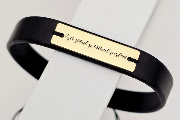 Un barbat obisnuit se poate indragosti, dar unul grozav poate deveni un sot devotat. Un barbat obisnuit poate fi tata, dar unul grozav va fi un tatic iubit. Arata-i sotului si/sau tatalui tau cat de mult inseamna pentru tine printr-o bratara special creata pentru el. DESPRE PRODUS: Placuta gravata este din Argint 925 placat cu Aur 18k si vine atasata pe o bratara din piele neagra sau maro. Pe acesta puteti alege sa gravati un mesaj special. Bratara este reglabila prin intermediul unui snur din matase vegetala prins la capetele bandei de piele. Dimensiunea minima standard este de 20 cm, insa aceasta poate fi modificata la cerere -> Spune-ne in casuta Marime bratara care este circumferinta incheieturii. Bratara din piele are latimea de 10 mm. Poti alege intre culoarea neagra sau maro. Spune-ne in casuta de comentarii ce culoare doresti. Gramaj aproximativ ARGINT 925:1.21 grame Aceasta bijuterie personalizata este realizata de la zero pentru fiecare comanda in parte.  Dupa plasarea si confirmarea comenzii incepe procesul ei de creatie:   Realizare Design -> Taiere/Personalizare -> Finisare manuala -> Polish Final -> Ambalare -> Livrare! Datorita procesului de productie si a personalizarii bijuteriei dupa propria dorinta gramajul final al produsului poate fi diferit. Din acest motiv pe site este afisat gramajul obtinut prin catarirea produsului realizat in pozele de prezentare. Pretul produsului include pe langa costul gramului de Argint 925 si tot procesul de mai sus, necesar pentru realizarea unui produs cu adevarat special pentru tine.     Toate produsele din Argint 925 comercializate de Chic Bijoux sunt marcate cu titlul Argintului· 925 · RECOMANDARI: Pentru ca bratara sa vi se potriveasca te rugam sa ne transmiti marimea in casuta. Nu scufundati bratara in lichide sau substante de curatare: pielea se poate decolora sau decoji, iar bijuteriile placate se deterioriaza si isi pot chiar schimba culoarea. Contactul zilnic cu apa (bai) sau cu produse chimice (spray-uri, detergenti, inalbitor, clor, diluanti etc.) pot de asemena sa afecteze bijuteria, existand riscul de a se desface si/sau de a se decolora.