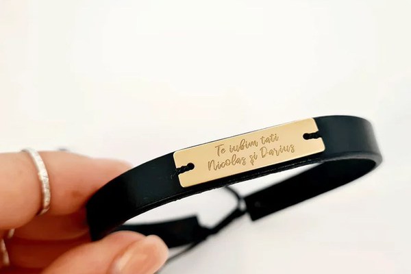 Un barbat obisnuit poate fi tata, dar unul grozav va fi un tatic iubit. Arata-i sotului si/sau tatalui tau cat de mult inseamna pentru tine printr-o bratara special creata pentru el. DESPRE PRODUS: Placuta gravata este din Argint 925 placat cu Aur 18k si vine atasata pe o bratara din piele neagra sau maro. Pe acesta puteti alege sa gravati un mesaj special. Bratara este reglabila prin intermediul unui snur din matase vegetala prins la capetele bandei de piele. Dimensiunea minima standard este de 20 cm, insa aceasta poate fi modificata la cerere -> Spune-ne in casuta Marime bratara care este circumferinta incheieturii. Bratara din piele are latimea de 10 mm. Poti alege intre culoarea neagra sau maro. Spune-ne in casuta de comentarii ce culoare doresti. Gramaj aproximativ ARGINT 925: 1.21 grame Aceasta bijuterie personalizata este realizata de la zero pentru fiecare comanda in parte. Dupa plasarea si confirmarea comenzii incepe procesul ei de creatie: Realizare Design -> Taiere/Personalizare -> Finisare manuala -> Polish Final -> Ambalare -> Livrare! Datorita procesului de productie si a personalizarii bijuteriei dupa propria dorinta gramajul final al produsului poate fi diferit. Din acest motiv pe site este afisat gramajul obtinut prin catarirea produsului realizat in pozele de prezentare. Pretul produsului include pe langa costul gramului de Argint 925 si tot procesul de mai sus, necesar pentru realizarea unui produs cu adevarat special pentru tine. Toate produsele din Argint 925 comercializate de Chic Bijoux sunt marcate cu titlul Argintului· 925 · RECOMANDARI: Pentru ca bratara sa vi se potriveasca te rugam sa ne transmiti marimea in casuta. Nu scufundati bratara in lichide sau substante de curatare: pielea se poate decolora sau decoji, iar bijuteriile placate se deterioriaza si isi pot chiar schimba culoarea. Contactul zilnic cu apa (bai) sau cu produse chimice (spray-uri, detergenti, inalbitor, clor, diluanti etc.) pot de asemena sa afecteze bijuteria, existand riscul de a se desface si/sau de a se decolora. Dupa plasarea comenzii va va contacta o colega din echipa Chic Bijoux pentru toate detaliile necesare personalizarii produsului.