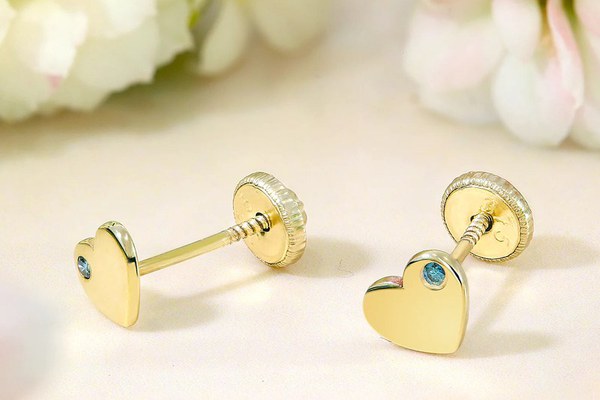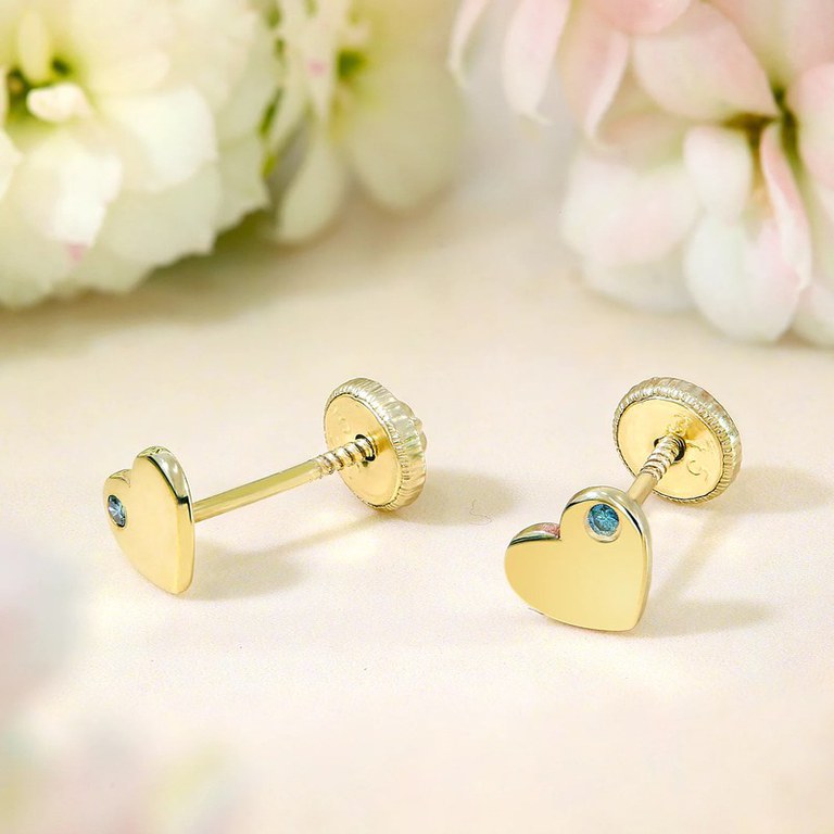 Cercei copii/bebe cu Diamant natural albastru - Model inima - Aur Galben 9K - Inchizatoare sigura si confortabila cu filet