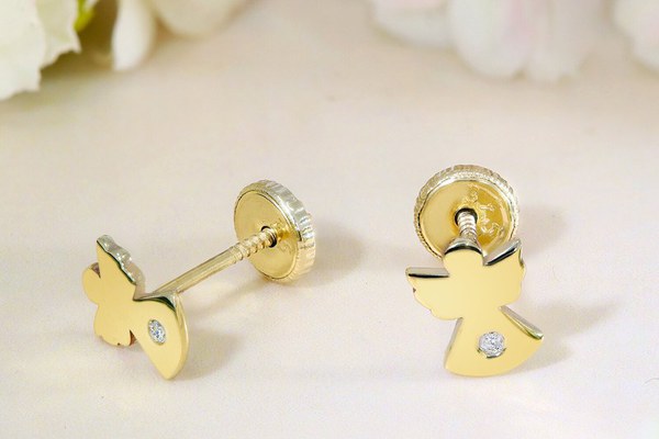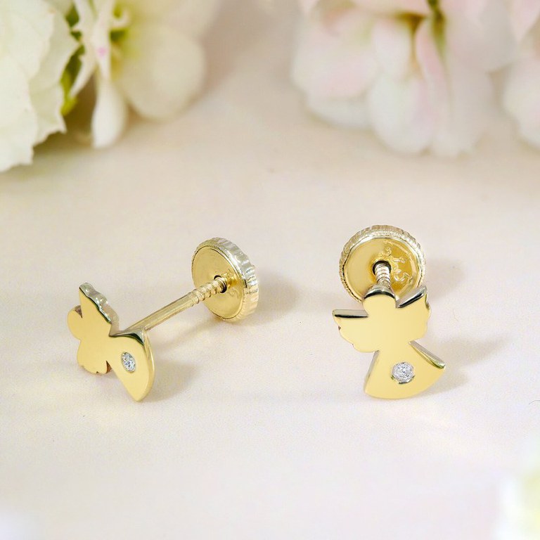 Cercei copii/bebe cu Diamant natural - Model ingeras - Aur Galben 9K - Inchizatoare sigura si confortabila cu filet